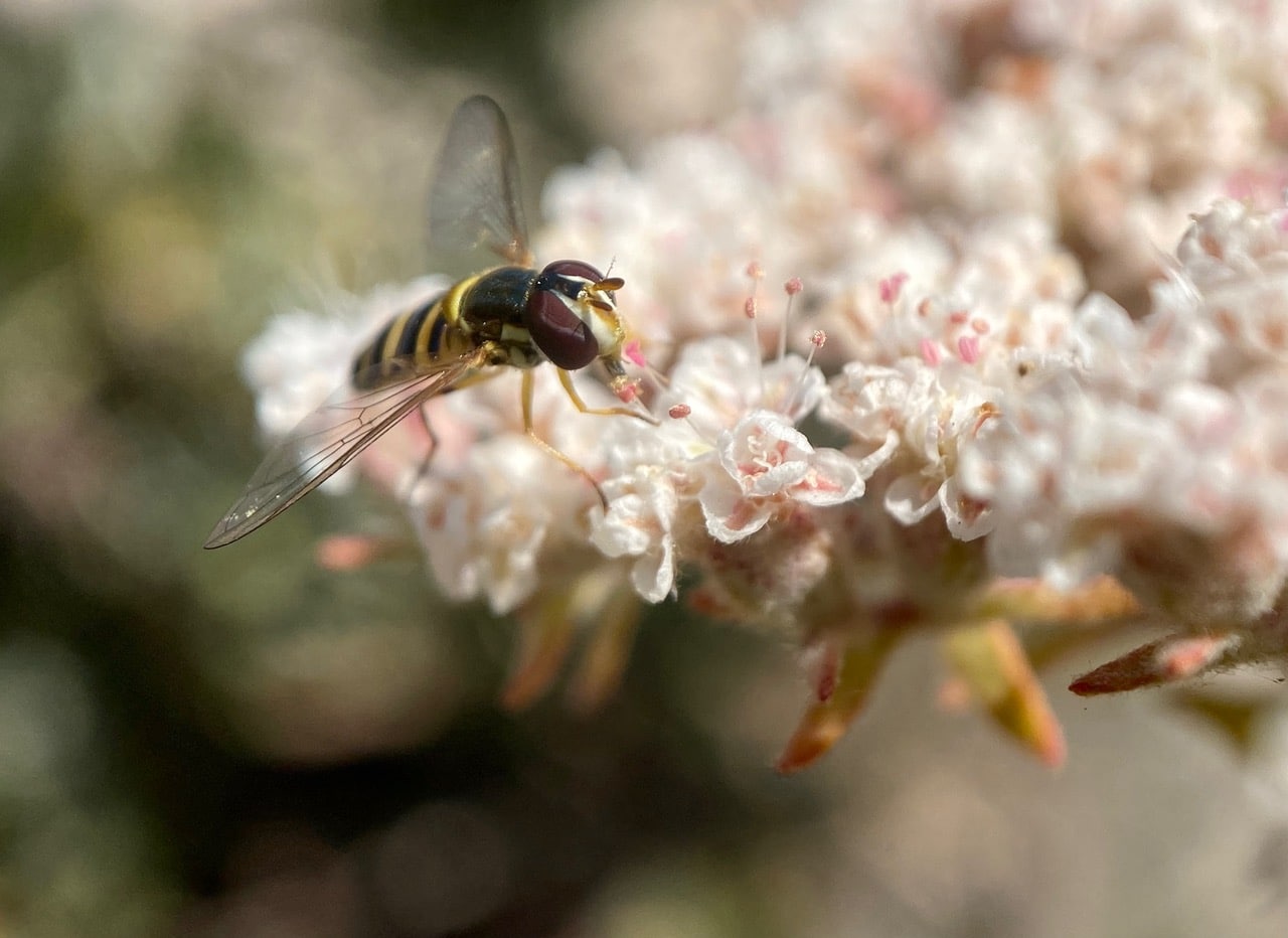A female Forked Globetail, Sphaerophoria sulphuripes (family Syrphidae) hovers over the buckwheat flowers. I have to get a good look at the tip of her abdomen to ascertain that she’s not another similar hover fly, the Diamond Spottail, Fazia micrura.