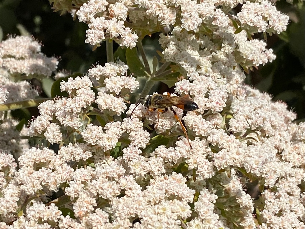 A Beewolf, Philanthus politus (family Crabronidae) is foraging on an inflorescence of St. Catherine’s Lace. It might also be on the hunt for potential prey.