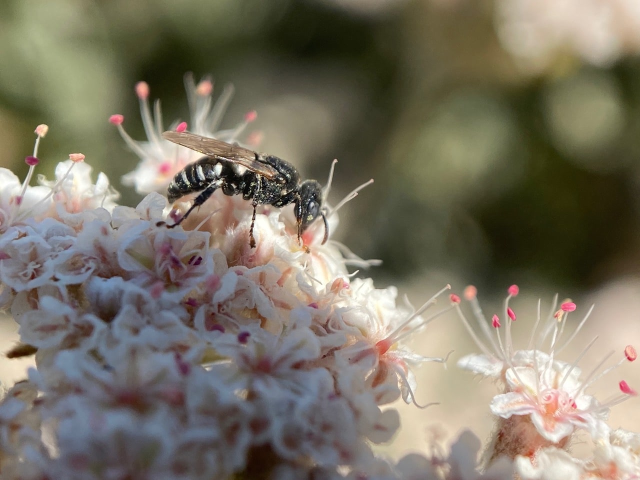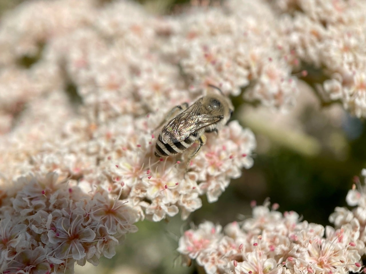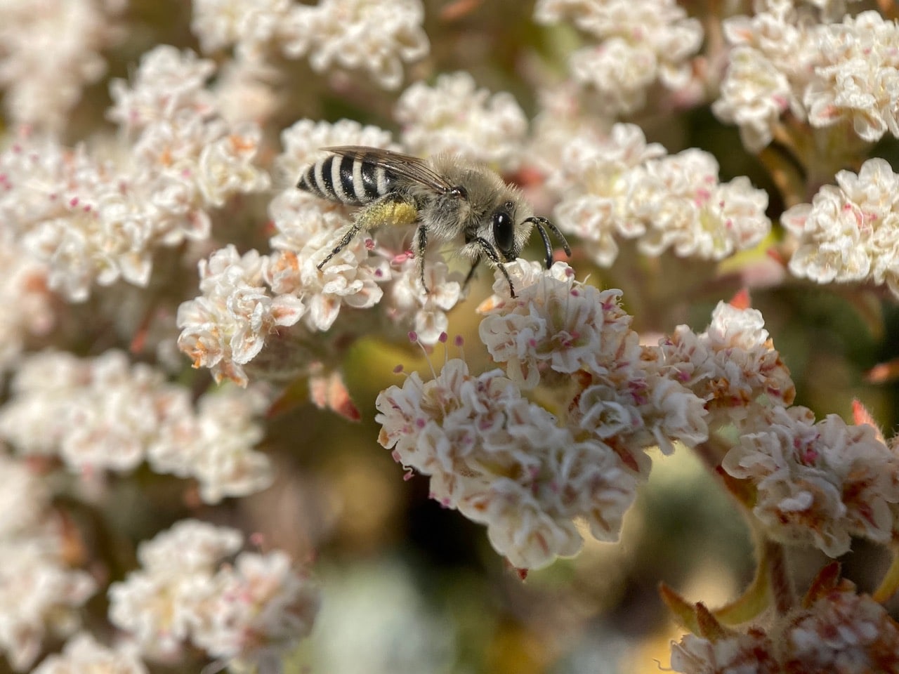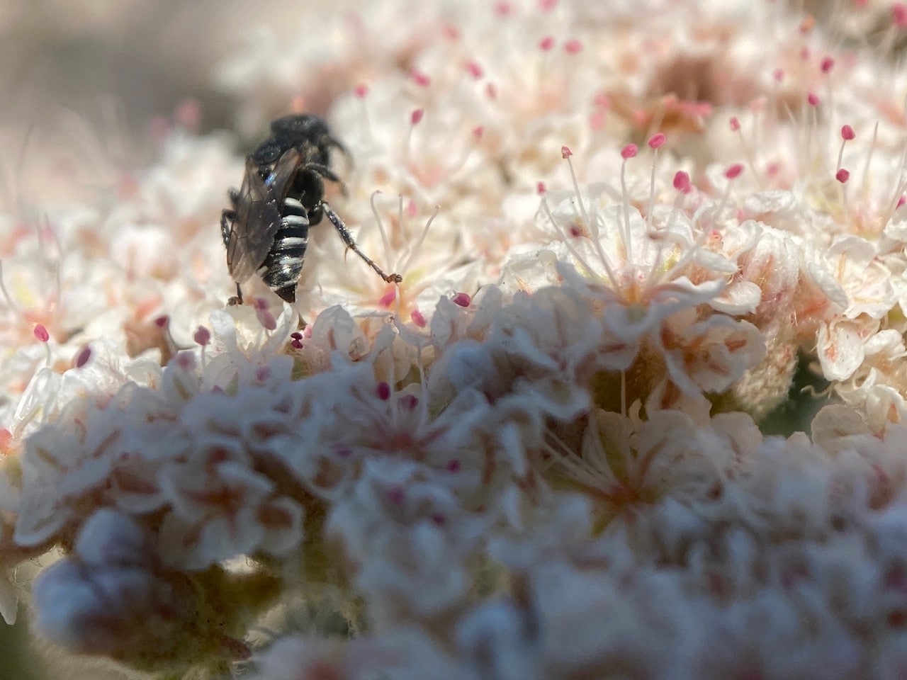 That’s the fuzzy, heart-shaped face of a Cellophane Bee, Colletes sp. (family Colletidae) on the inflorescence of St. Catherine’s Lace, Eriogonum giganteum!