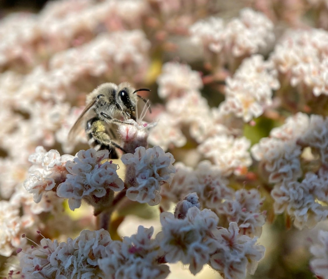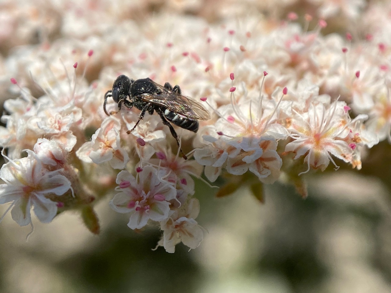 The shallow, open-faced, tightly clustered flowers of St. Catherine’s Lace are perfect foraging ground for these short-tongued bees.