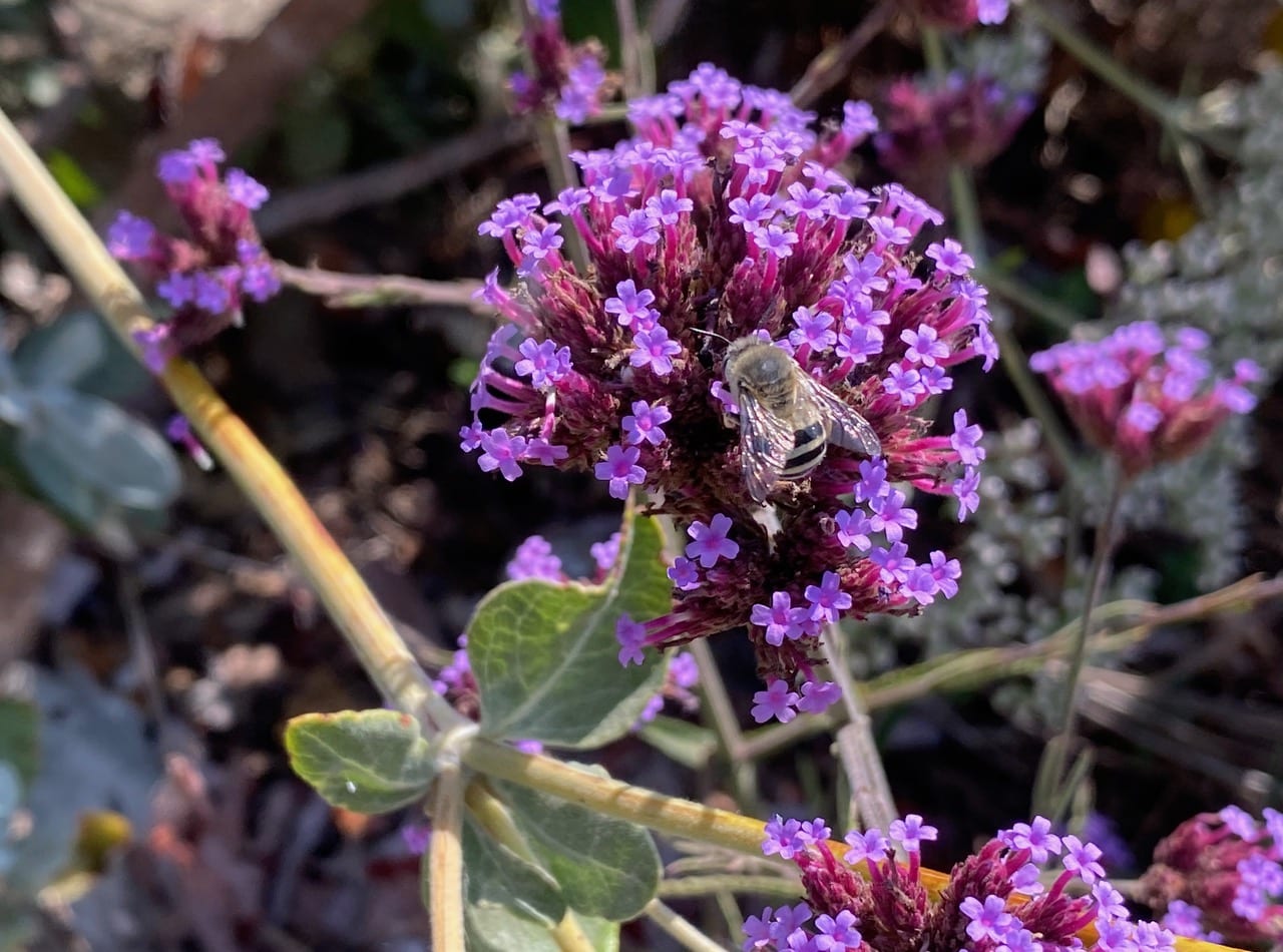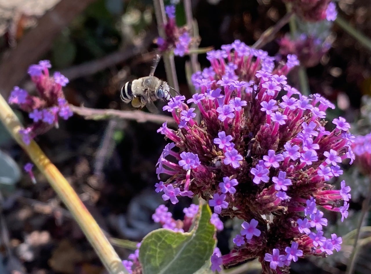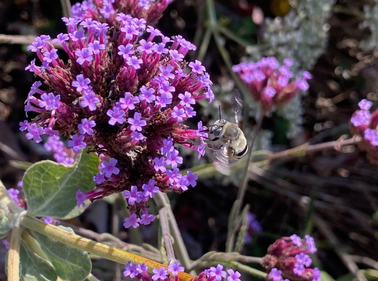 A Short-sun Digger Bee, Anthophora curta (subgenus Micranthophora, family Apidae) is hovering in front of a flower cluster of Purpletop Vervain, Verbena bonariensis.