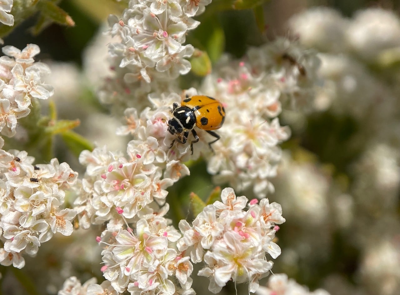 A Convergent Lady Beetle, Hippodamia convergens (family Coccinellidae) is foraging on an inflorescence of St. Catherine’s Lace. Both the adults and larvae of Lady Beetles are voracious predators of aphids and other small, soft-bodied insects. When prey is scarce, the beetles often feed on protein-rich pollen.