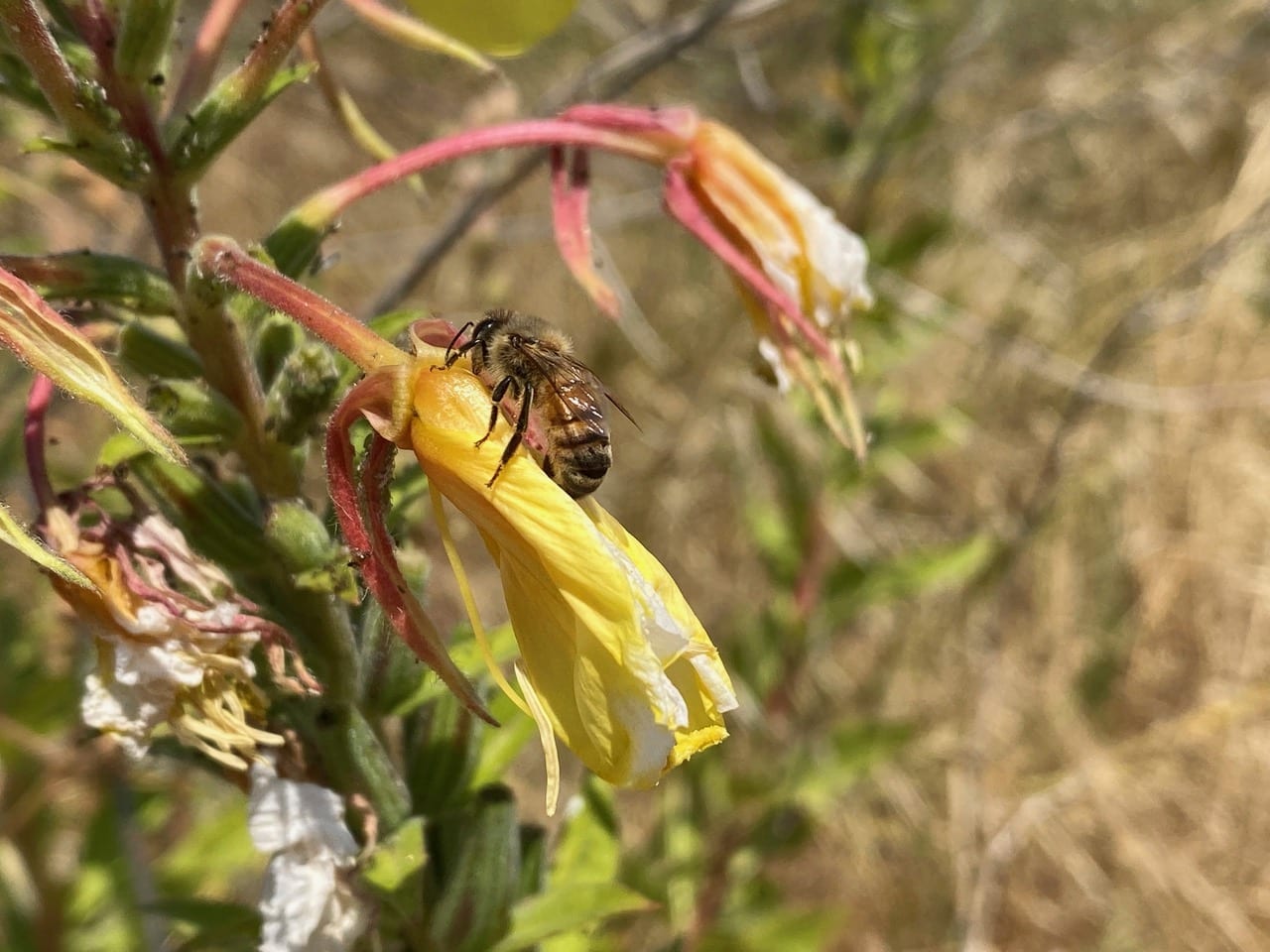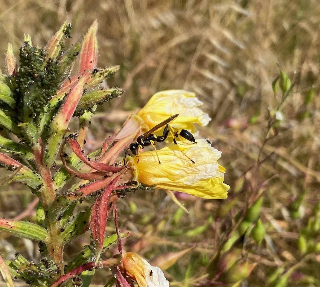 What is the Honey Bee doing on the wilted Tall Evening Primrose flower? Is nectar still being produced by the flower? Maybe the bee is scavenging honeydew excreted by the aphids?