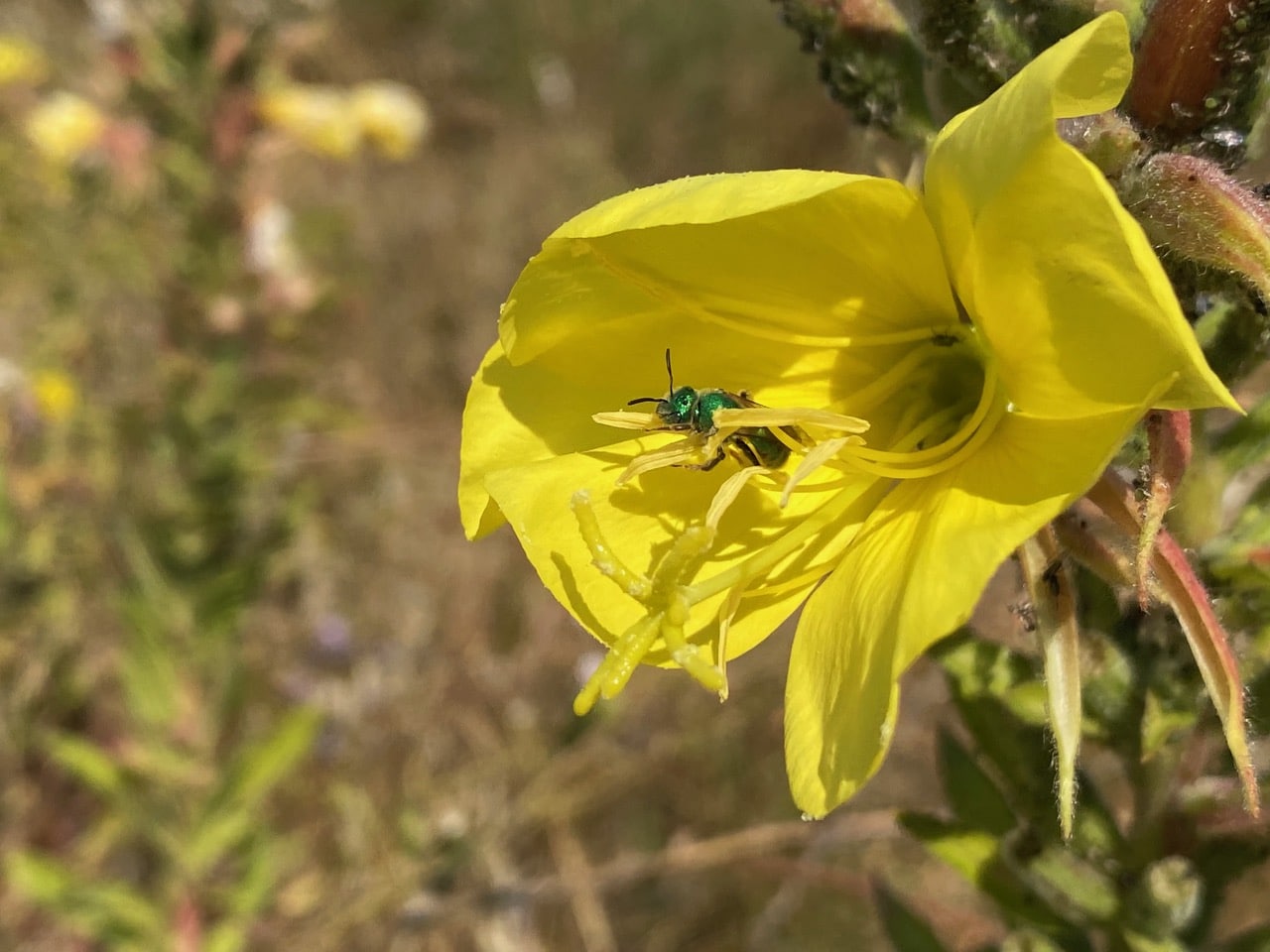 A female Fine Striped Sweat Bee, Agapostemon subtilior (family Halictidae) emerges from the base of the evening primrose flower where she has been taking nectar.