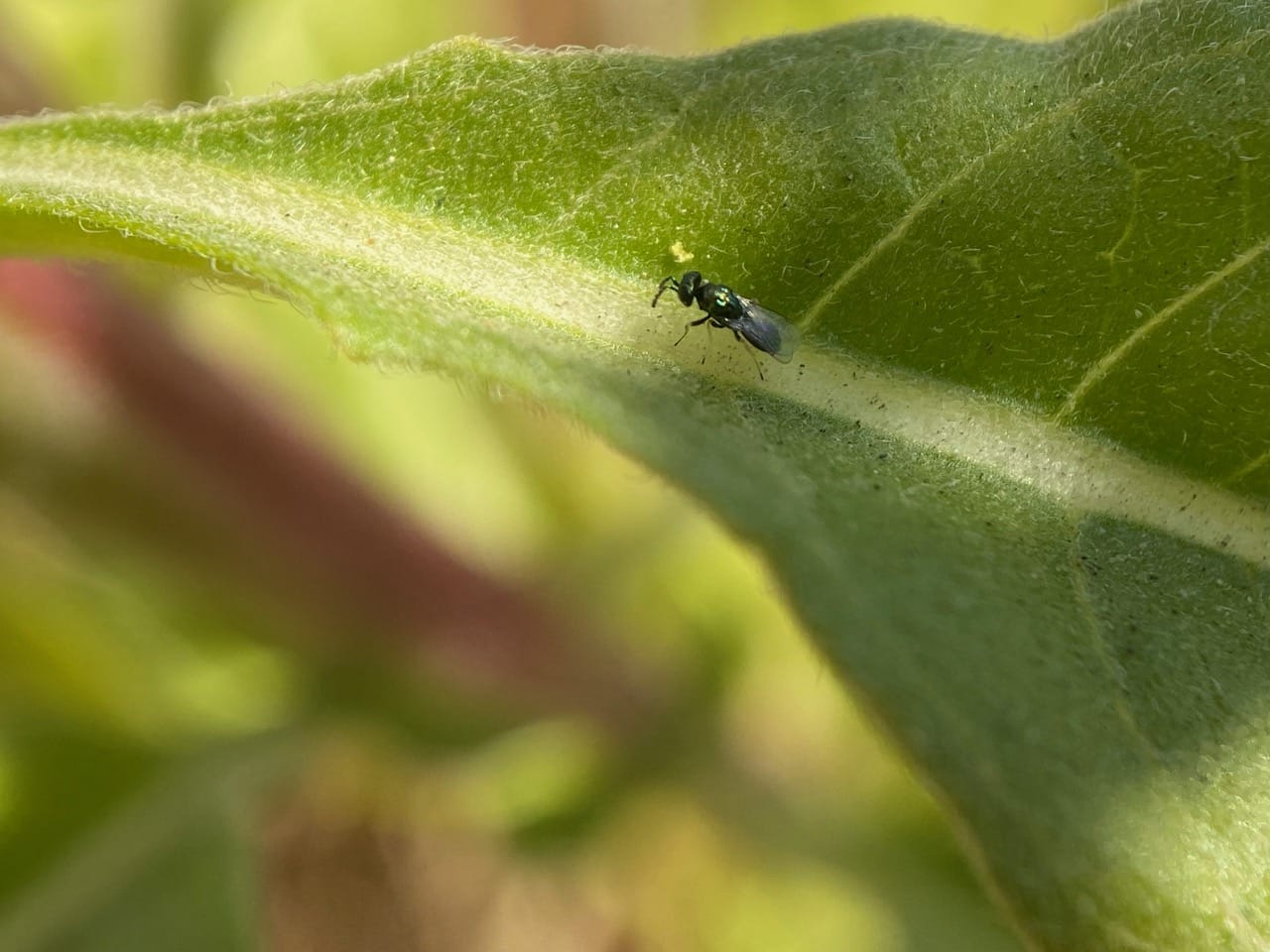 A tiny, metallic wasp is crawling along a leaf of Tall Evening Primrose. It is a Chalcidoid Wasp (superfamily Chalcidoidea).