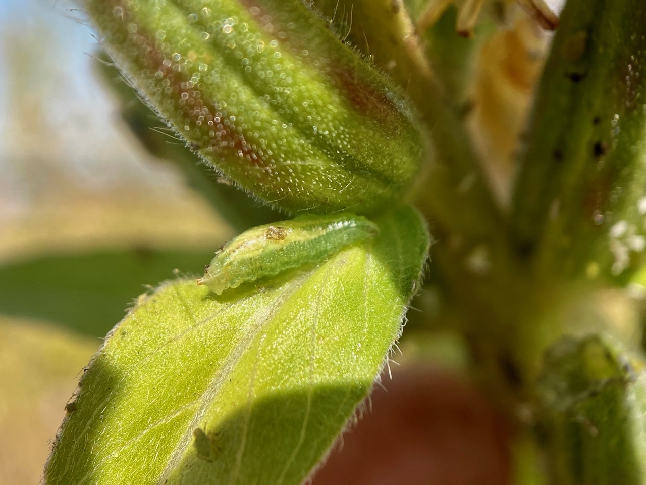 A hover fly larva has tucked itself in the space between a stipule and a developing fruit of Tall Evening Primrose. We are looking at its rear end.