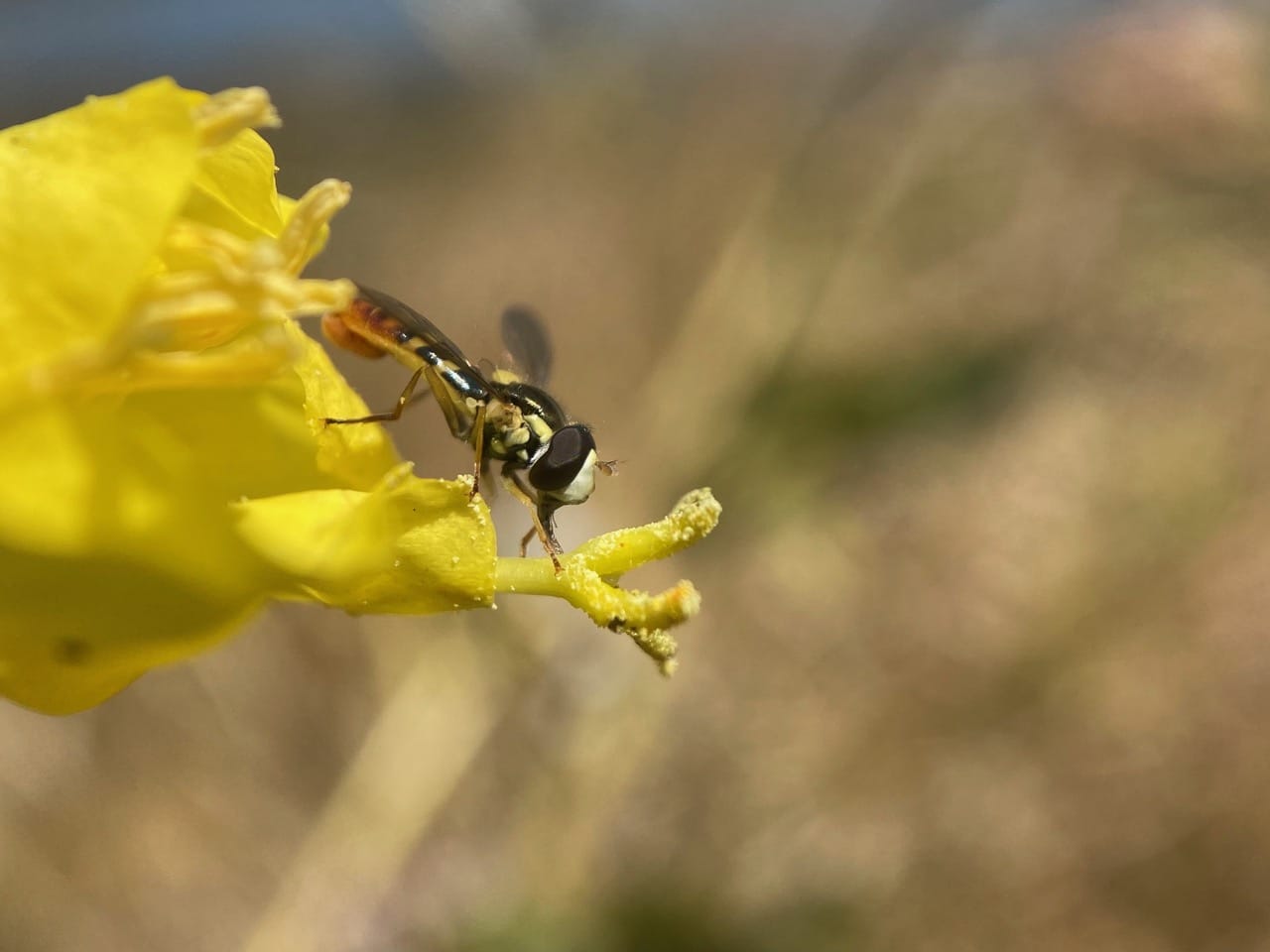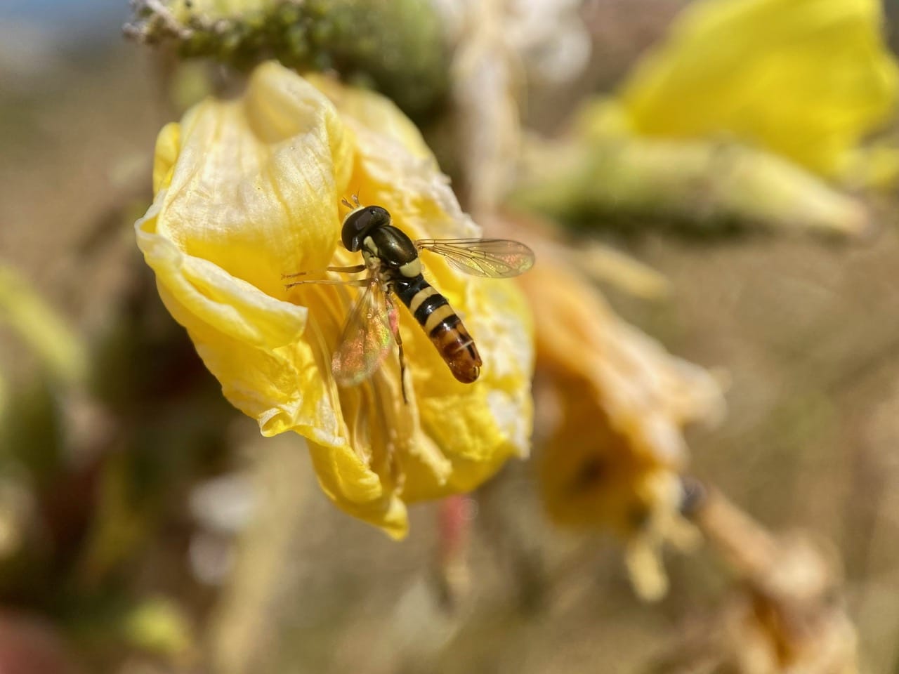 A male Forked Globetail, Sphaerophoria sulphuripes (family Syrphidae) has landed on a spent flower of Tall Evening Primrose.