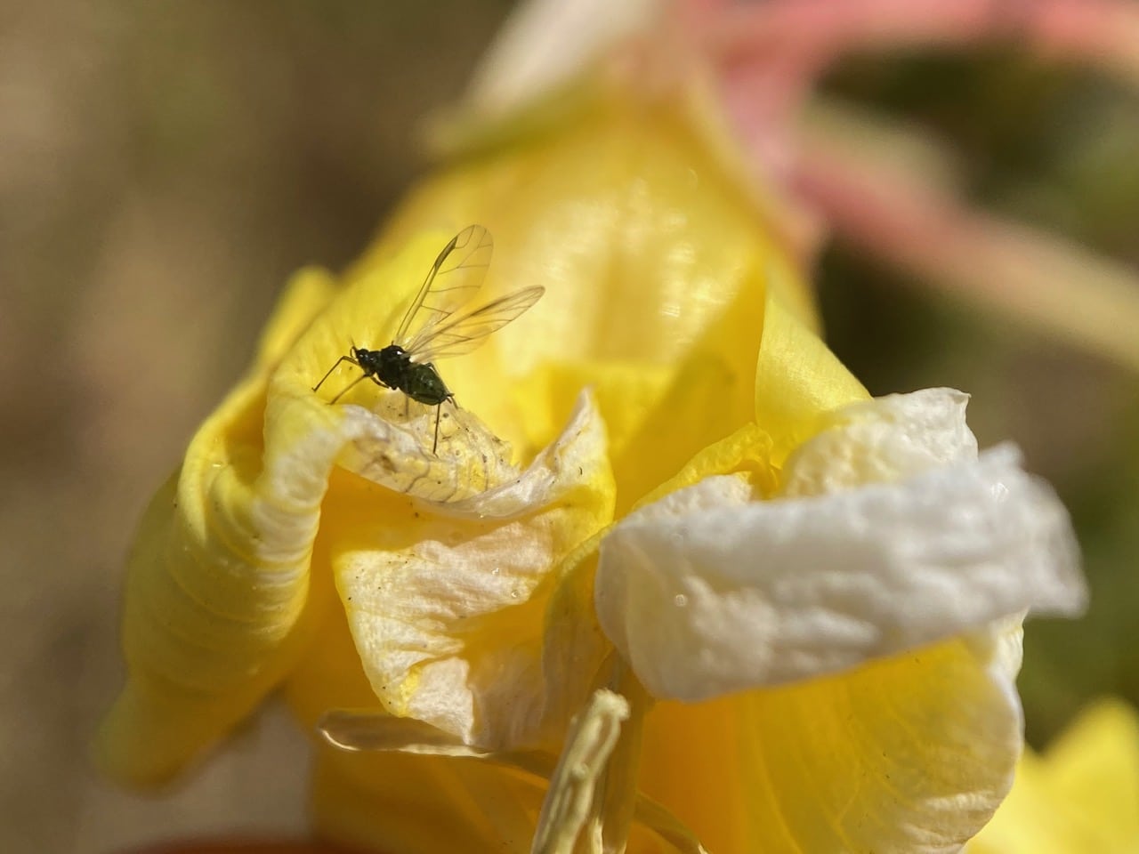 A winged aphid (an alate) is resting on a faded flower of Tall Evening Primrose.