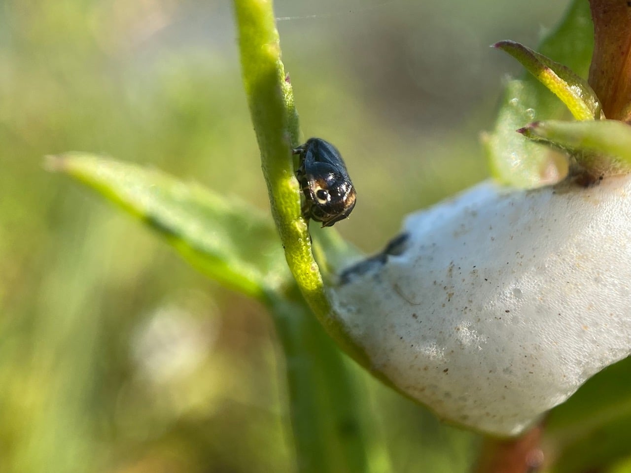 Hey, that’s not an exuvia. It’s an adult Spittlebug, Complex Clastoptera lineatocollis (family Clastopteridae) on a leaf next to its former home. Don’t be fooled by that shiny, eye-like structure on the side of the insect. It is actually on the bug’s hind wing, masquerading as an eye.