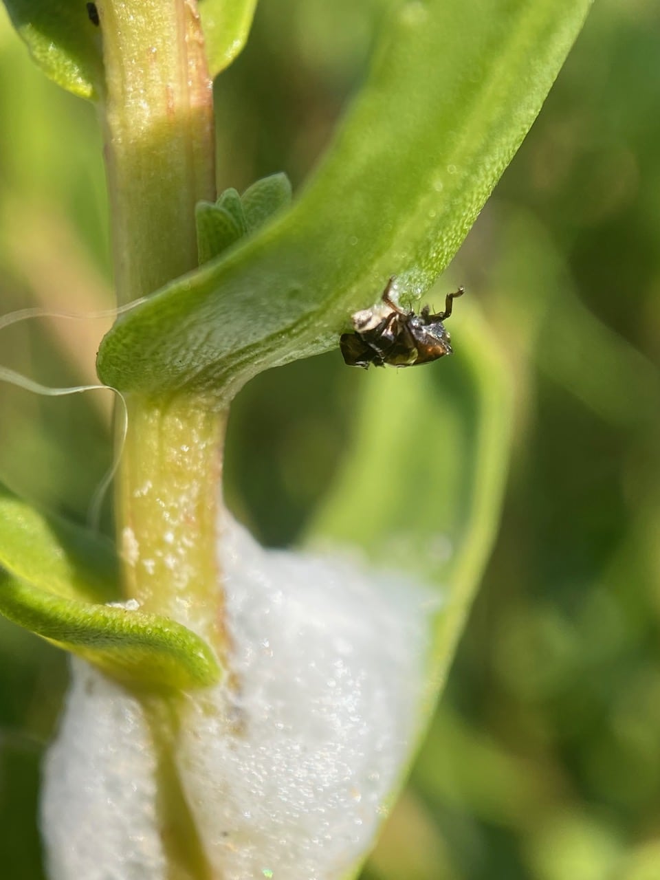 Checking out a Spittlebug foam mass on a leaf axil of Grindelia, I find a brown exuvia (exoskeleton shed during molting) clinging to the stem above the foam. Mature nymphs leave their foam mass for their final molt into an adult.