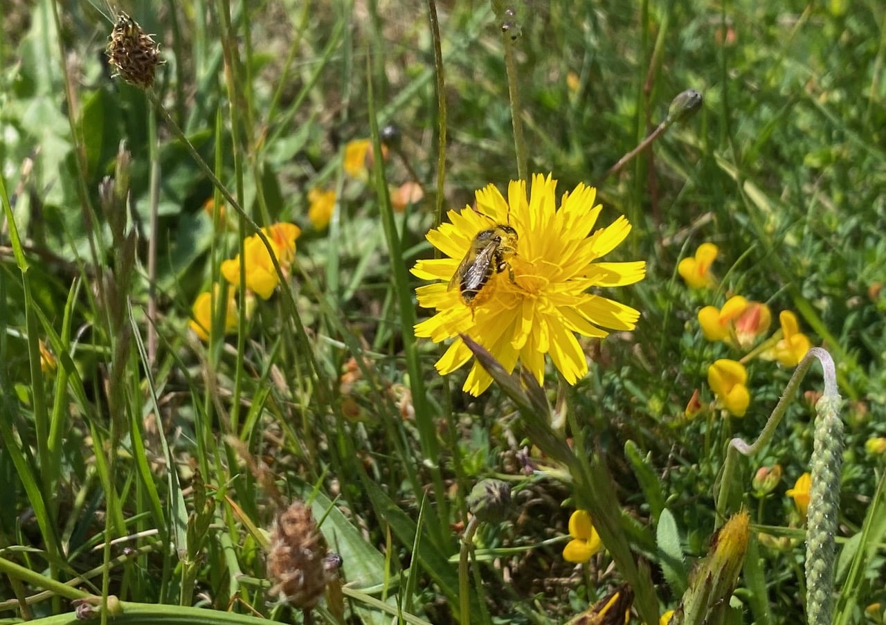 The bee then flies down to take nectar from the small flowers of Birdsfoot Trefoil, Lotus corniculatus. Most bees are not particular about their nectar sources.