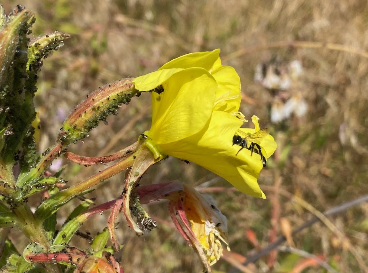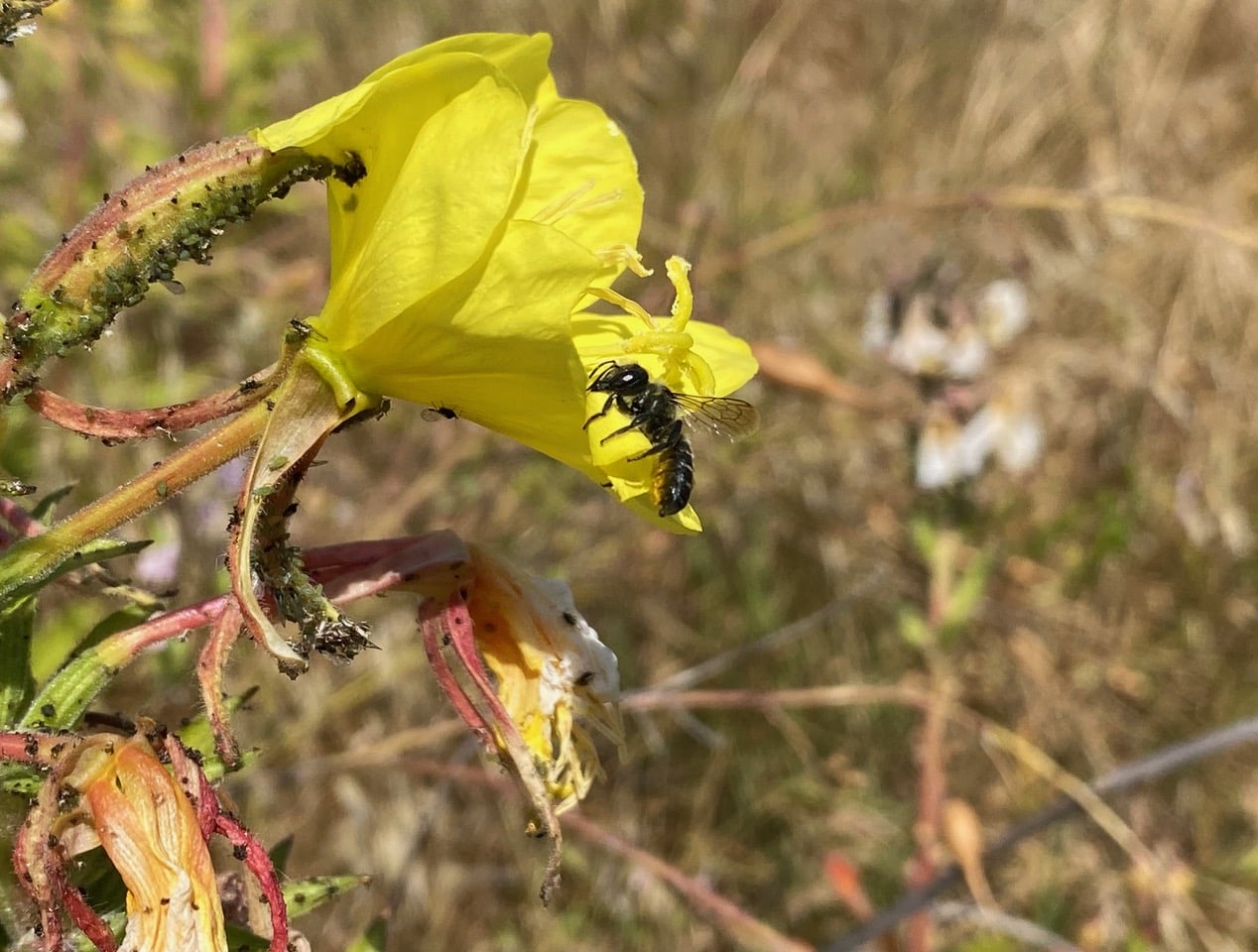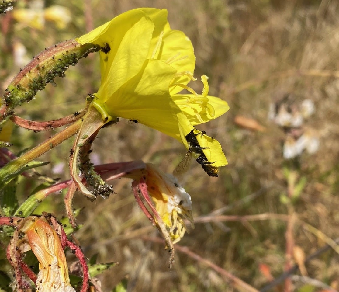 As I look up, I spot a dark insect enter a Tall Evening Primrose flower and head for nectar at the base.