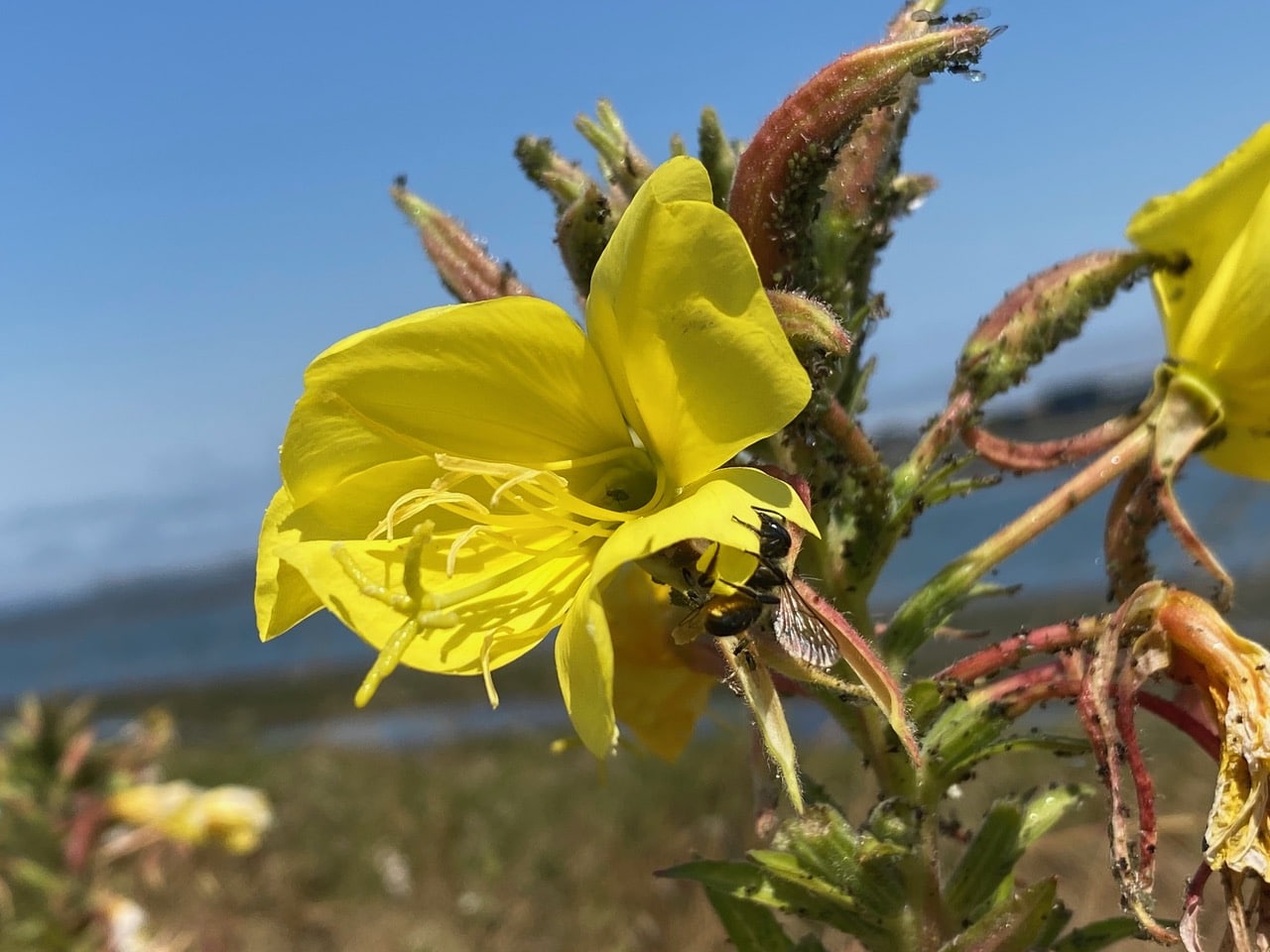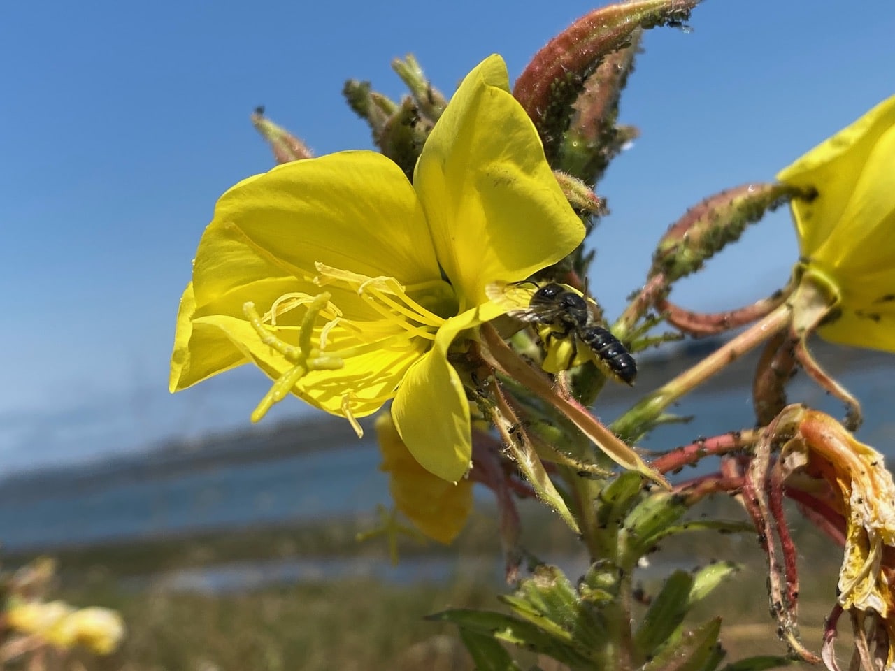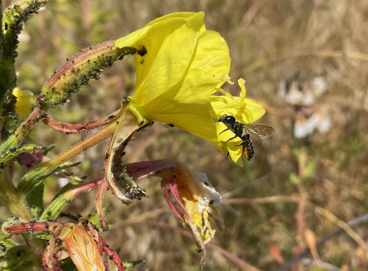As I look up, I spot a dark insect enter a Tall Evening Primrose flower and head for nectar at the base.