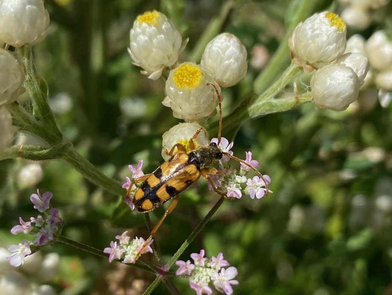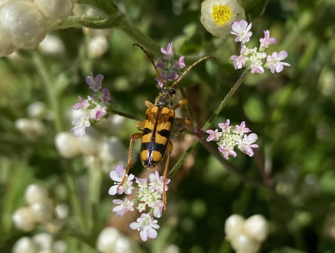 A Flower Longhorn Beetle, Xestoleptura crassipes (family Cerambycidae, subfamily Lepturinae) is foraging on a flower umbel of the weedy Torilis arvensis (family Apiaceae).