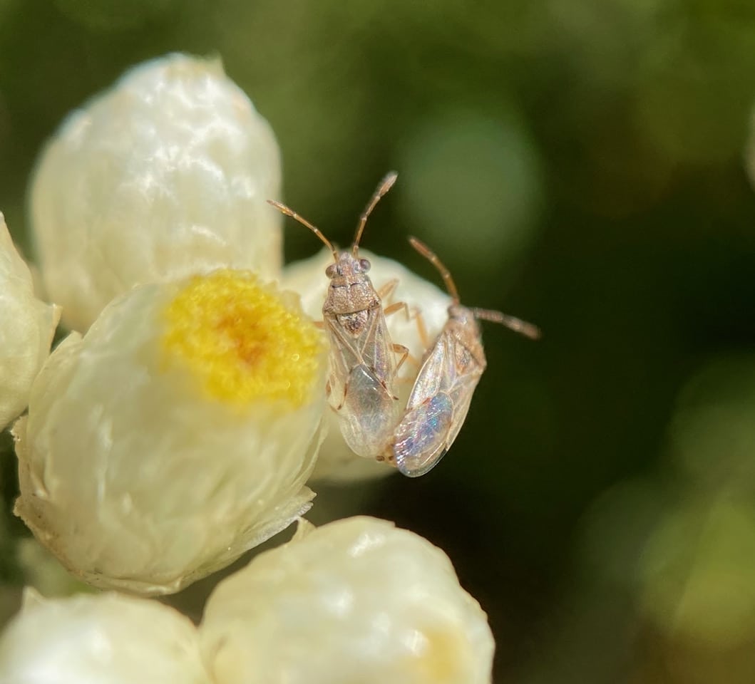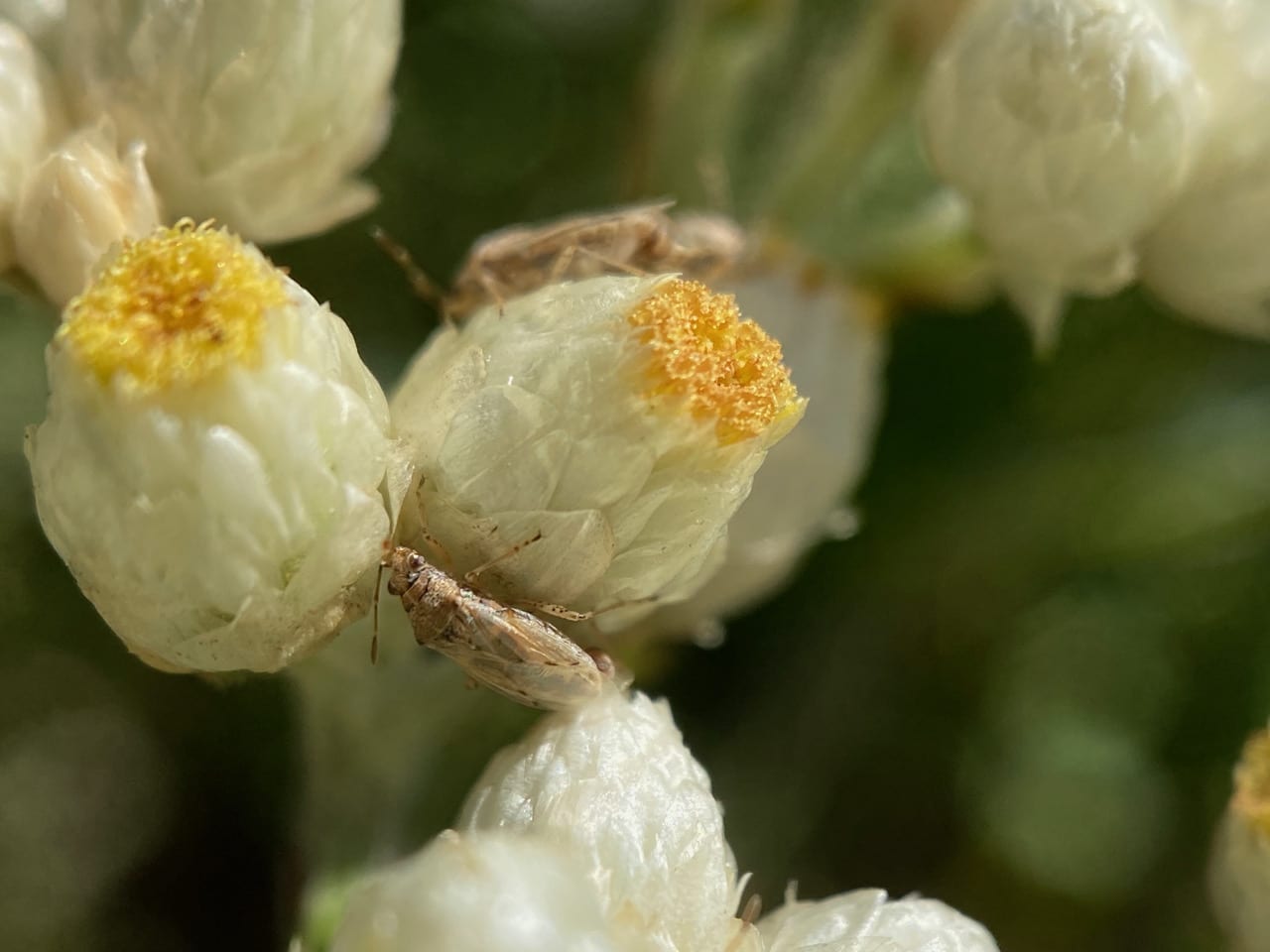 A False Cinch Bug, Nysius raphanus (family Lygaeidae or seed bugs) is roaming the inflorescence of California Everlasting flowerheads.