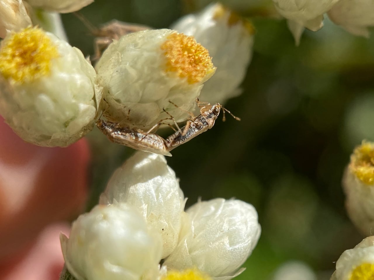 The False Cinch Bugs are everywhere on this California Everlasting, many of them mating.
