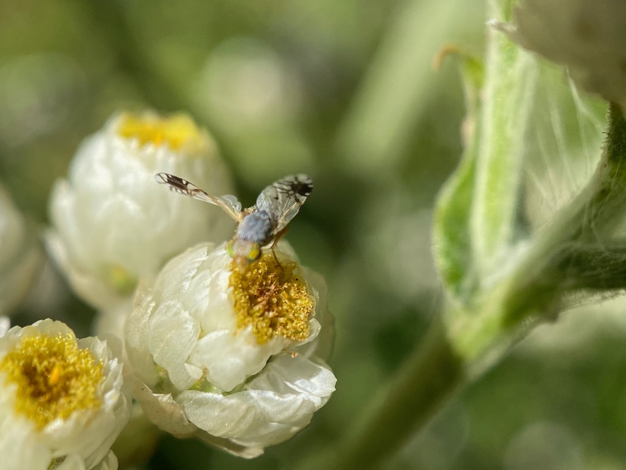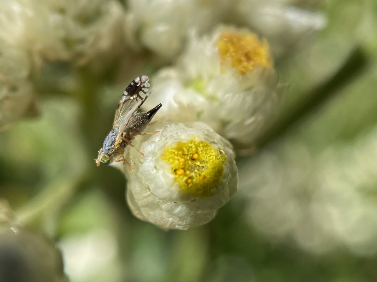I am happy to report that this species of Fruit Flies commonly seen on the California Everlasting has been identified by a Tephritidae expert as Trupanea californica. The species uses the flowerheads of many species of Gnaphalium and related genera.