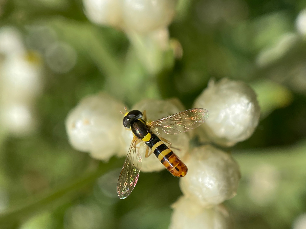 A male Forked Globetail, Sphaerophoria sulphuripes (family Syrphidae) lands on a flowerhead of California Everlasting, Pseudognaphalium californicum. The males of this species of hover fly is easily identified by their slim, elongate, straight sided abdomen tipped in red. The genitals are curled under the tip of the abdomen, forming a bulbous structure that gives rise to the common name, Globetail.