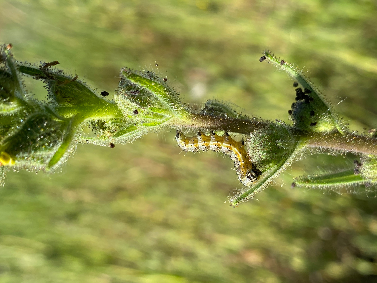 A young caterpillar of the Small Owlet Moth, Heliothodes diminutiva (family Noctuidae) is feeding on an immature flowerhead of Coast Tarweed. Note the frass (insect poop) left on the sticky plant.