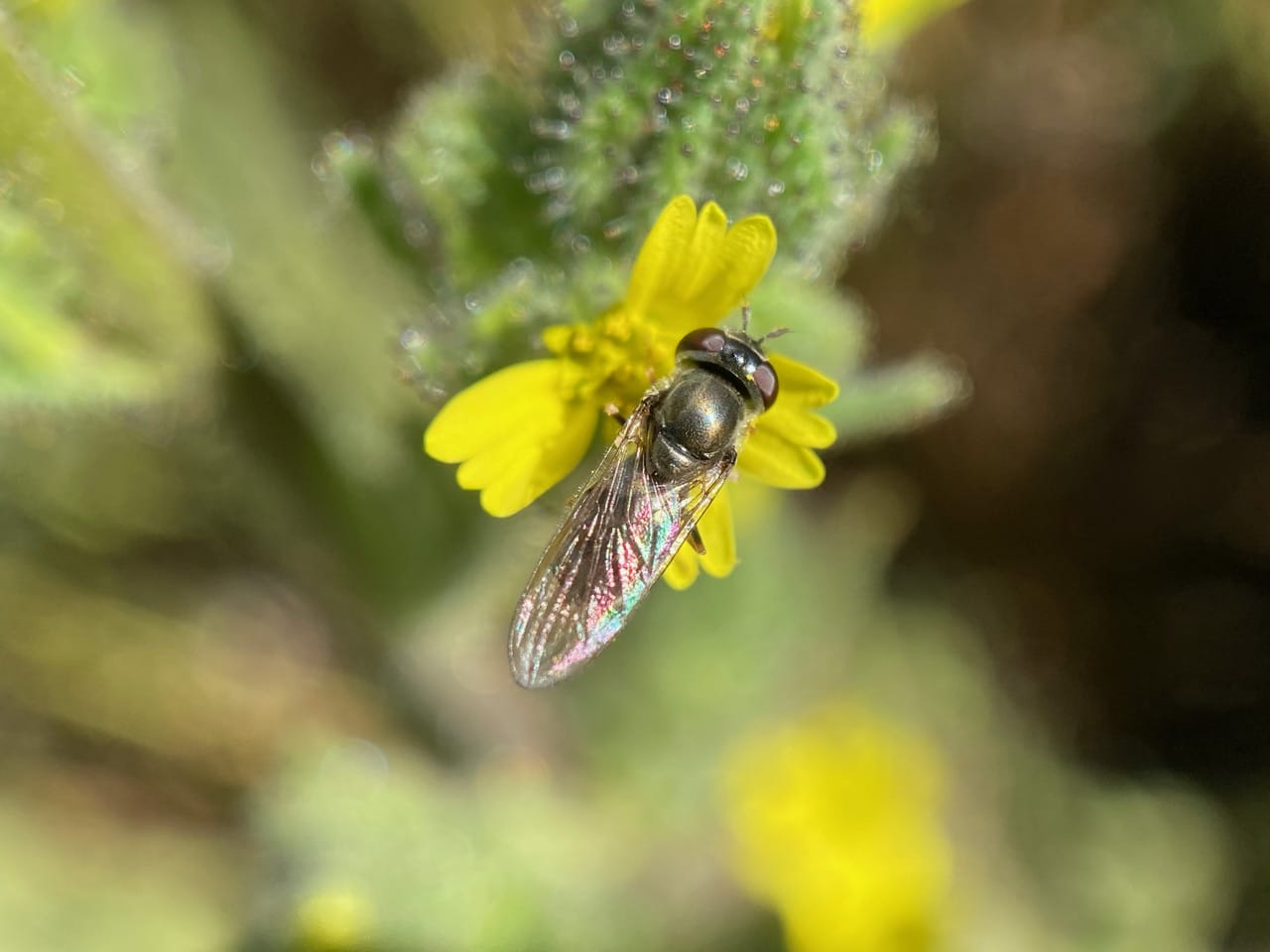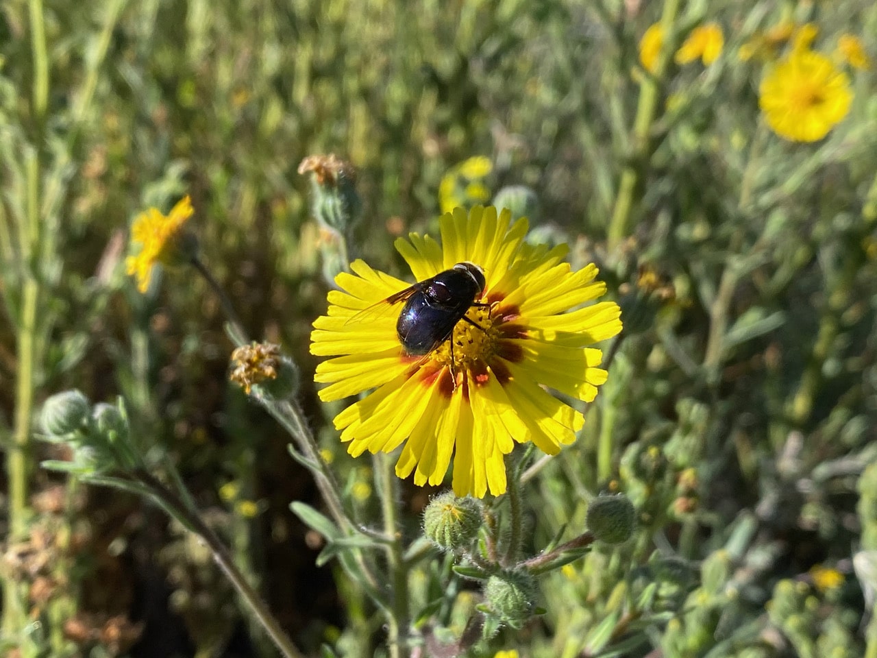 A large, shiny black insect buzzes through the tarweed patch. First mistaken for a Carpenter Bee, its true identity is revealed as soon as it lands on a flowerhead. It is no bee, it’s our largest hover fly – the Purple Bromeliad fly, Copestylum violaceum (family Syrphidae).