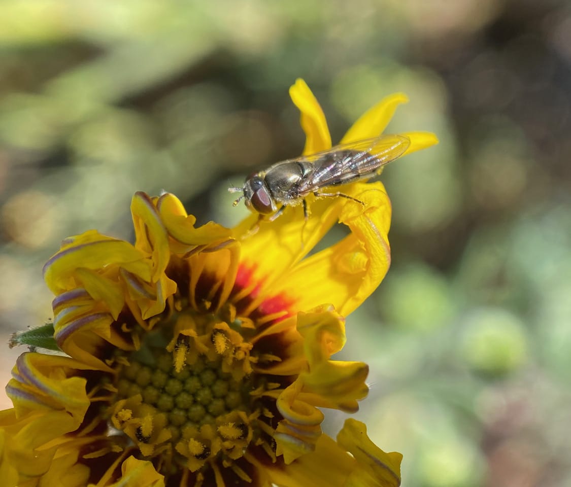 A female Sedgesitter, Platycheirus sp. (family Syrphidae) visits a flowerhead of Coast Tarweed, Madia sativa. The sexes of most hover flies can be determined by the placement of the eyes. Males have holoptic eyes that meet along a central line on top of the head, while the females’ compound eyes are set apart with a gap in between.