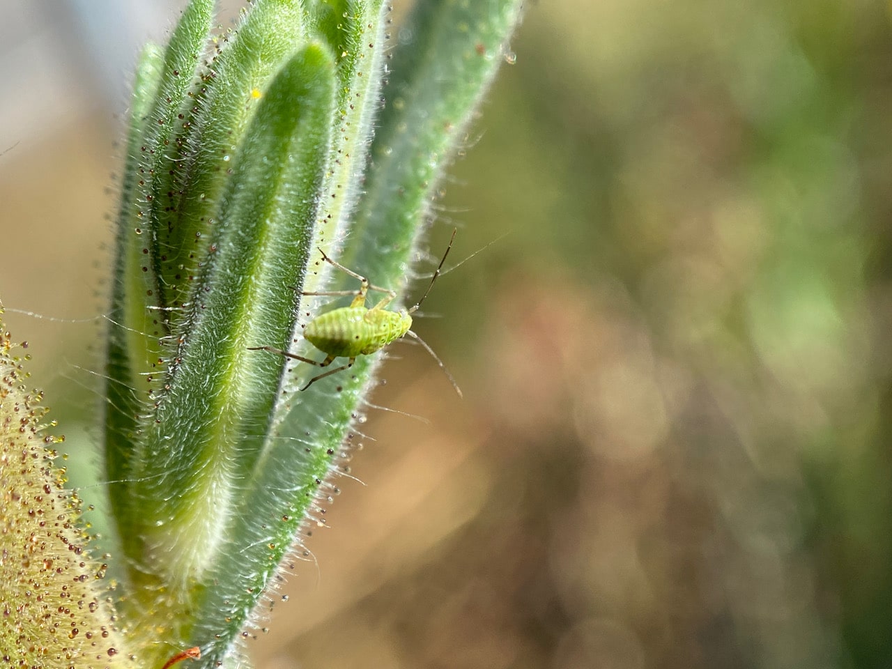 A nymph of the Lygus Bug, Lygus sp. (family Miridae) is walking on the foliage of Elegant Tarweed.“True bugs” in the order Hemiptera undergo incomplete metamorphosis without a pupal stage. The nymphs, which look like adults, develop through a series of molts, each time getting bigger after shedding their old exoskeleton. At the last molt, they transform into adults with functional wings and reproductive parts.
