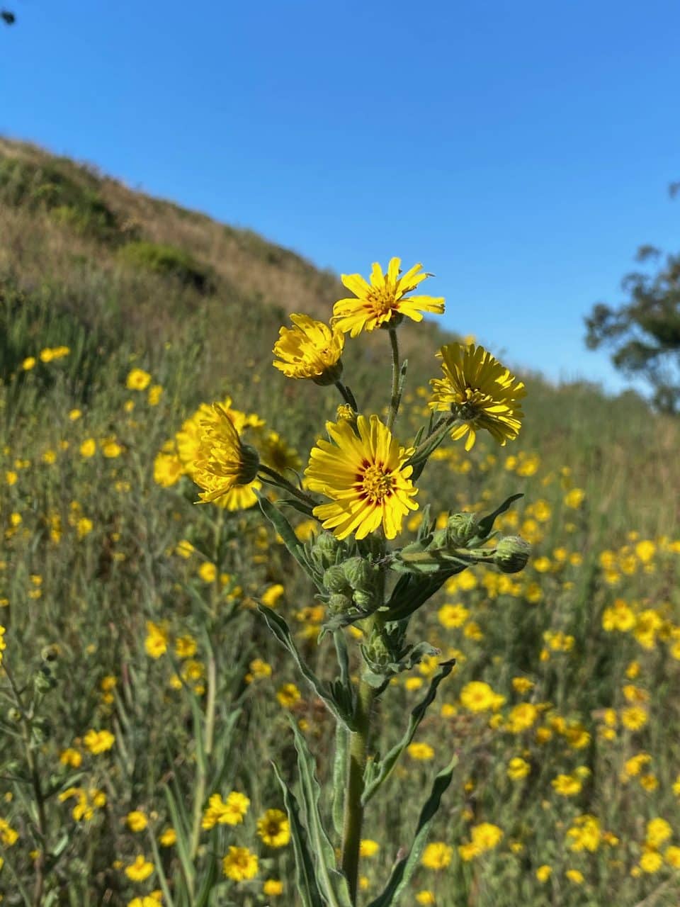 This is a fleeting moment in the morning, when the sun is already bright and the Elegant Tarweed flowerheads, Madia elegans are still open. The flowerheads are closed by mid-morning on most days.