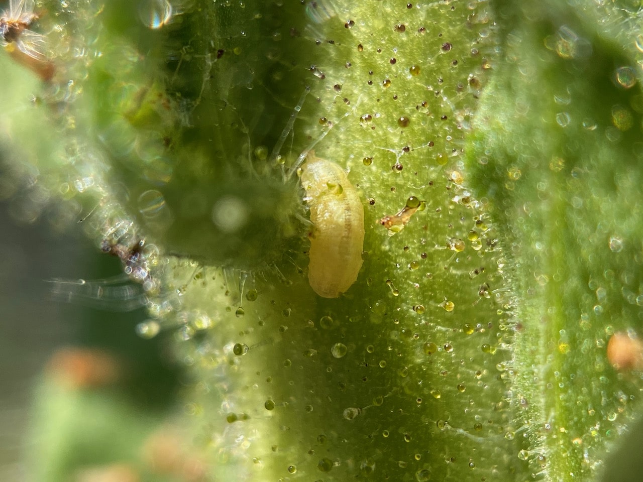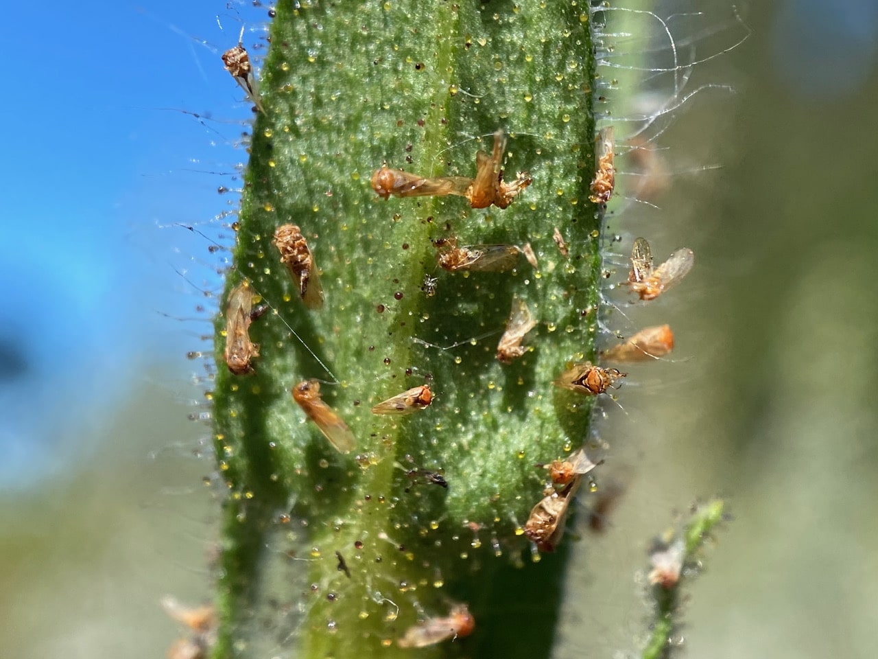 Native to Australia, the Psyllid nymphs and adults feed on sugar rich phloem of Eucalyptus. Honeydew is a sticky waste product excreted by the psyllids after digesting phloem. As nymphs feed they can use honeydew excretions to form a protective white cap called a “lerp”, the conspicuous white cone seen on eucalyptus leaves. Nymphs feed and grow to adulthood under this crystalline cap. Winged adults (4 mm) leave the protection of the lerp and fly to new plants to mate, feed, and lay eggs.