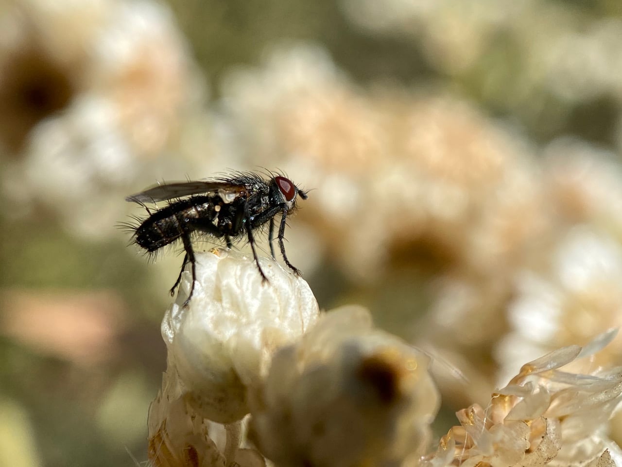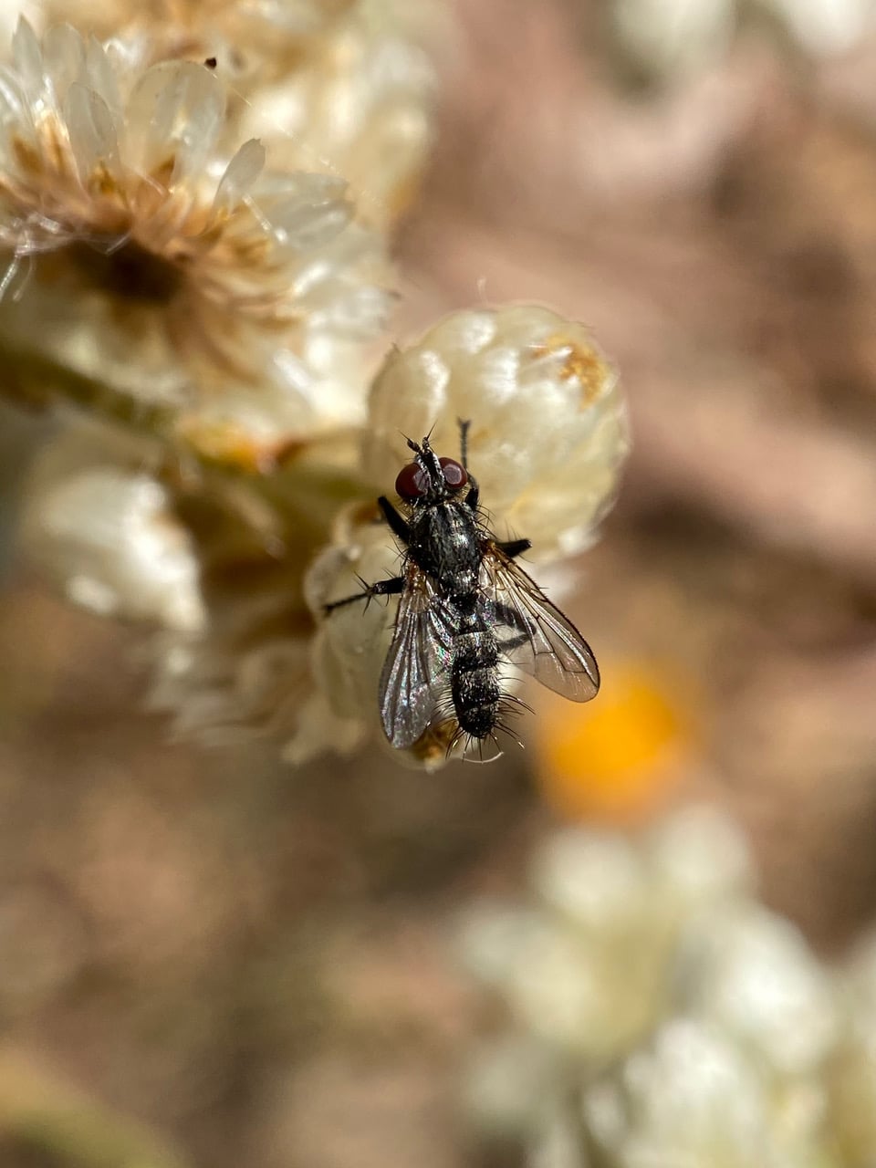 A small, dark bristly fly lands on a flowerhead of California everlasting.