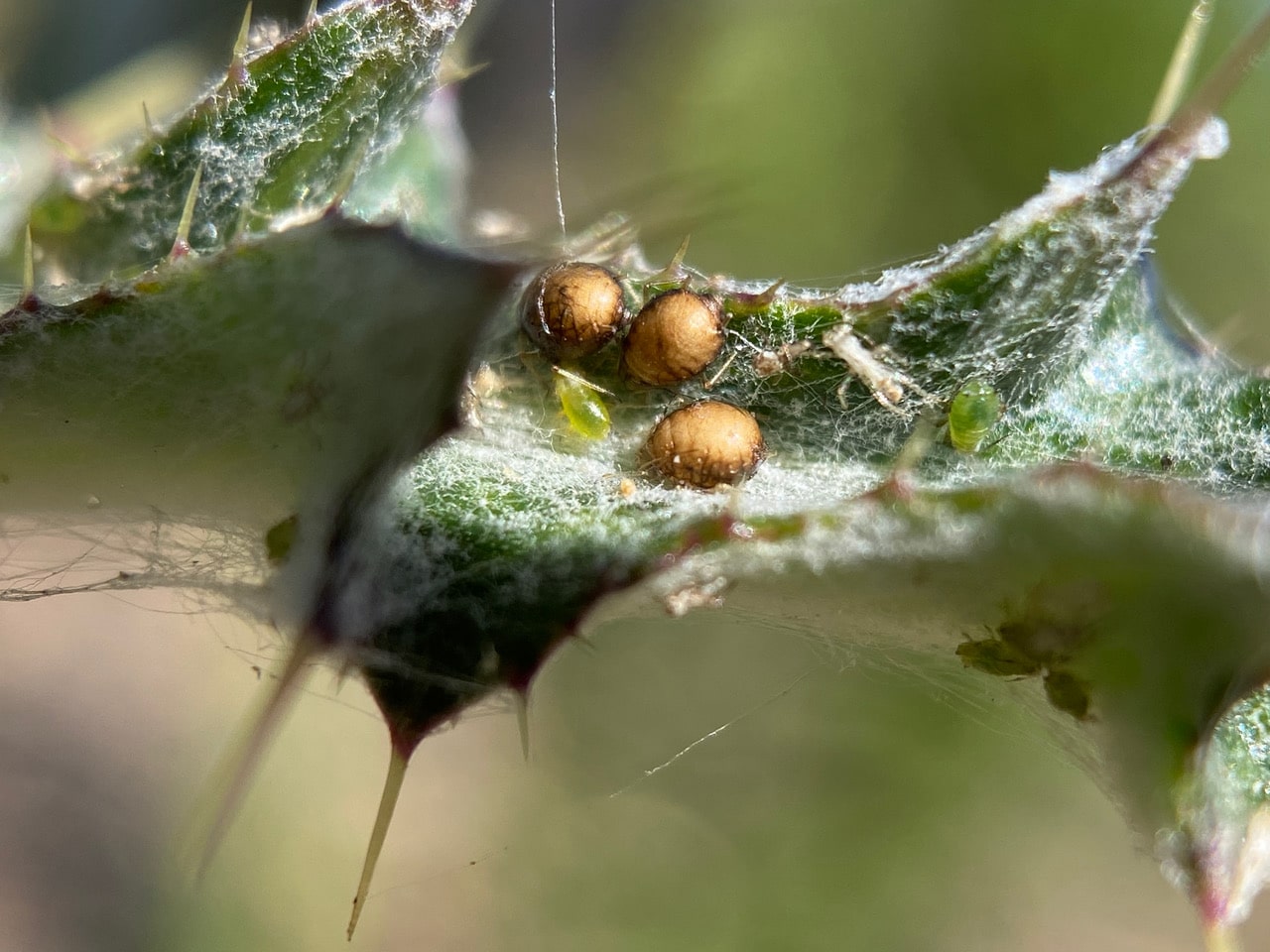 While looking for caterpillar nests on the young Cobweb Thistles, I find these tiny but conspicuous brown things on the leaves. They are aphid mummies! There are a few healthy green aphids around as well.