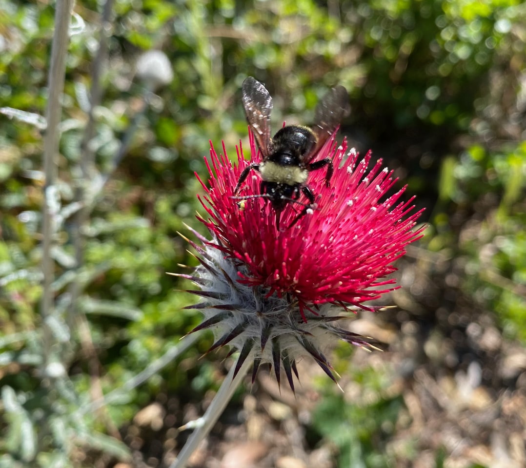 Some Bumble Bees are foraging on the Cobweb Thistle, Cirsium occidentale, their heads buried in the flowerheads. I have to patiently wait for them to look up to ascertain their identity. Most of them are the Yellow-faced Bumble Bees, Bombus vosnesenskii, while a few with black heads are California Bumble Bees, Bombus californicus.