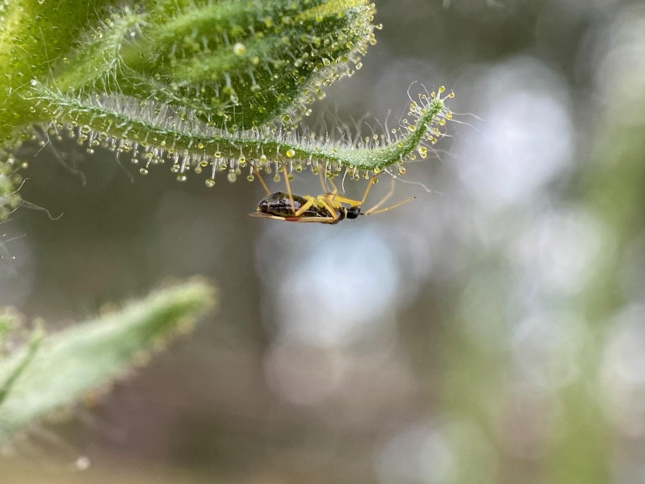 A side view shows that the body of the bug is mostly black. Although there’s little available information about the bug’s biology, I suspect that it is an opportunistic predator – feeding on small insects trapped on the sticky plant.