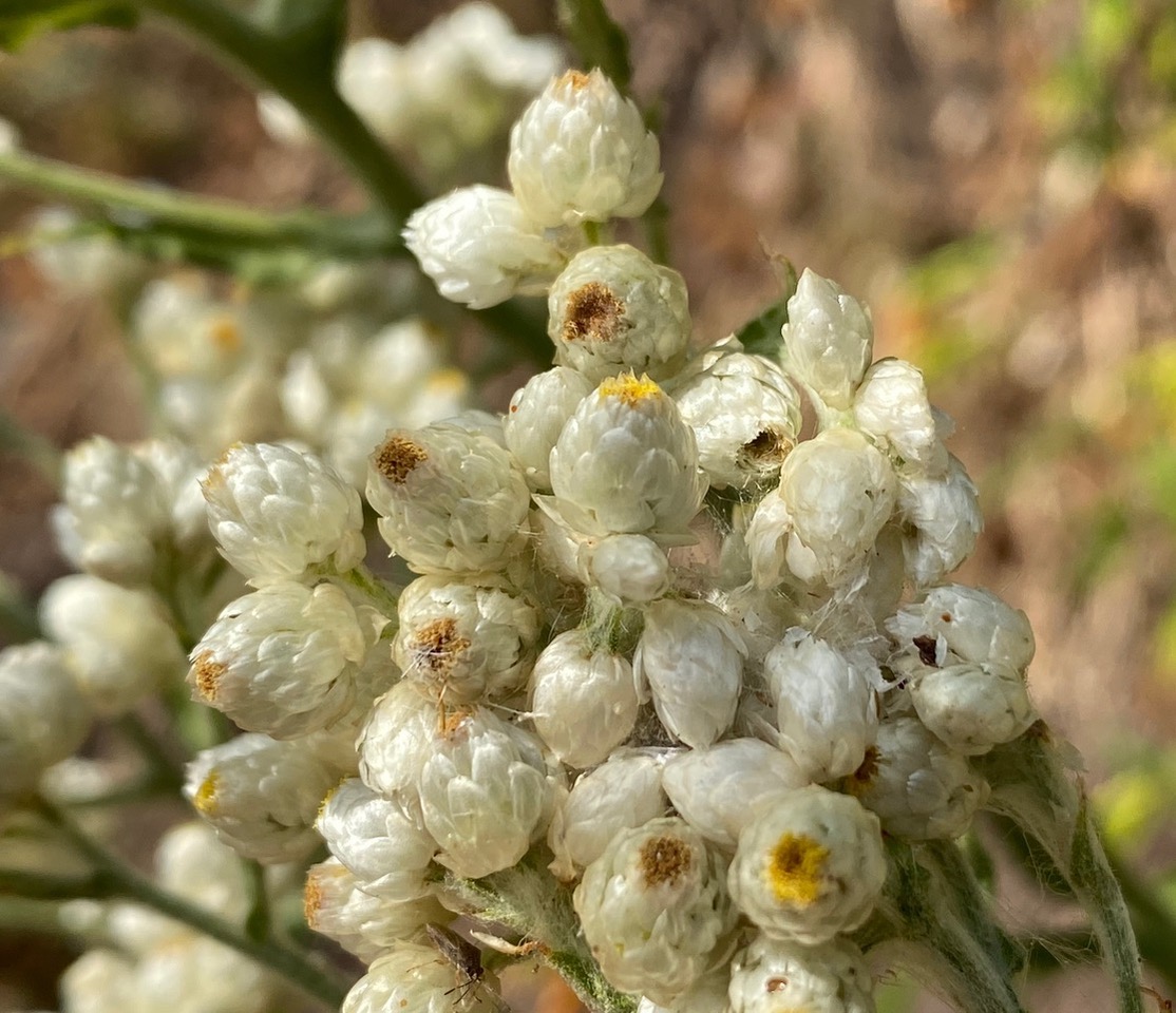 Numerous California Everlasting and their flowers lie in shreds along the paved road. I stop by this site where I have watched an American Lady caterpillar weave its nest among the flowerheads.