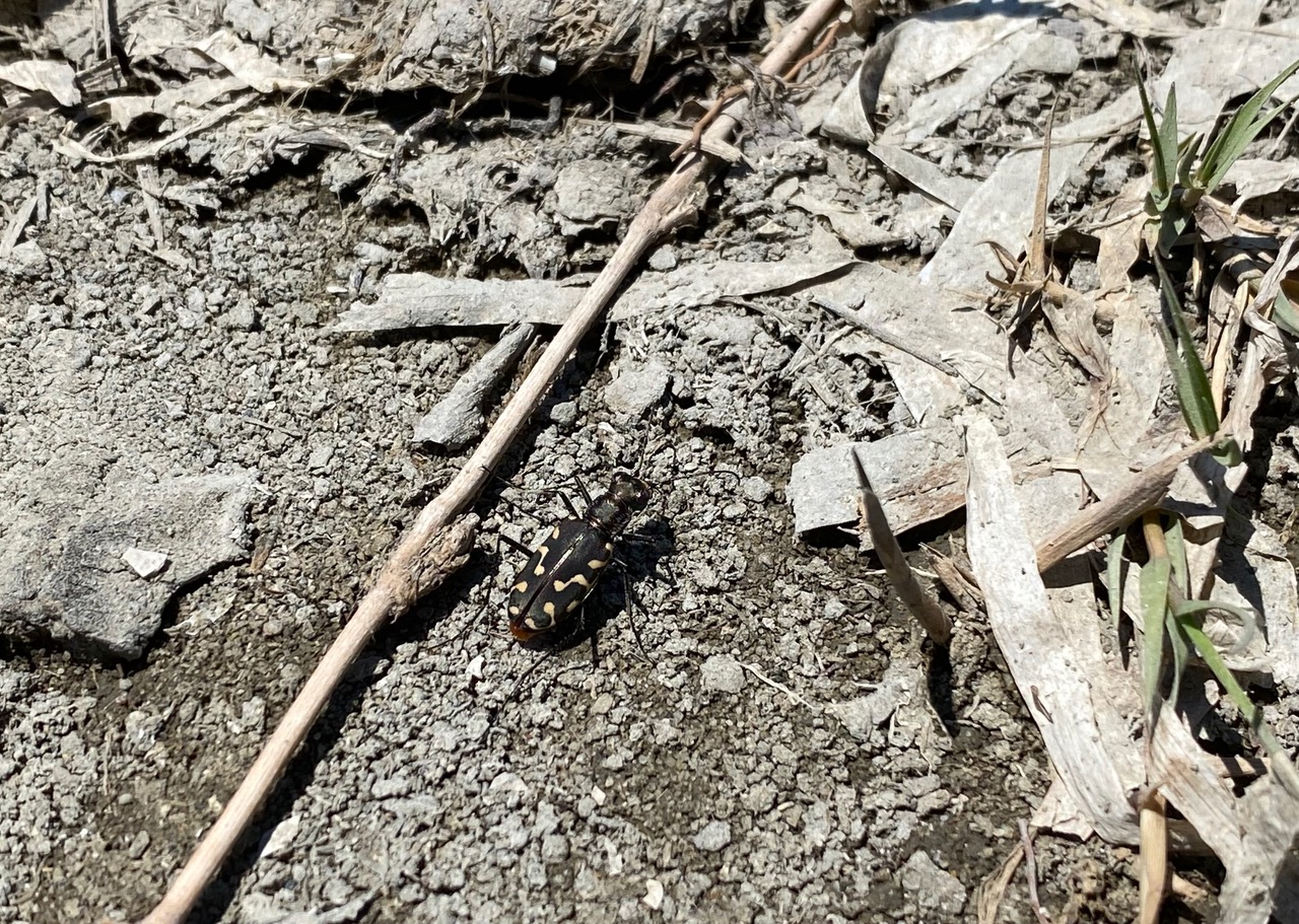 Tiger Beetles are a family of beetles, Cicindelidae, known for their aggressive predatory habits and running speed. The fastest known species can run at about 125 body lengths per second! Tiger Beetles often have large bulging eyes, long, slender legs and large curved mandibles. All are predatory, both as adults and as larvae. The genus Cicindela has a cosmopolitan distribution, is usually diurnal and may be out on the hottest days. The fast-moving adults run down their prey and are extremely fast on the wing. Apparently their running speed exceeds their brain’s ability to process visual images – occasionally the beetles have to abruptly stop in mid-chase to visually reorient. What a riot to watch!