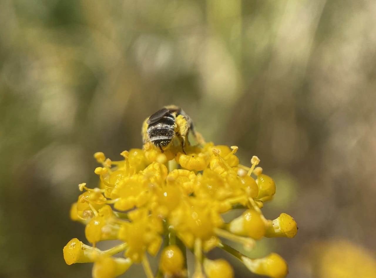 A Tripartite Sweat Bee, Halictus tripartitus (family Halictidae) is collecting pollen on an umbel of Fennel flowers.