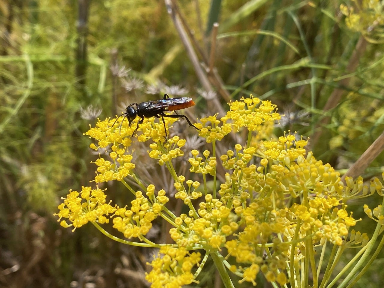 A large black wasp with an orange-red abdomen is taking nectar on a flower umbel of Fennel. It is a female Thread-waisted Burrowing Wasp, Sphex lucae (family Sphecidae).