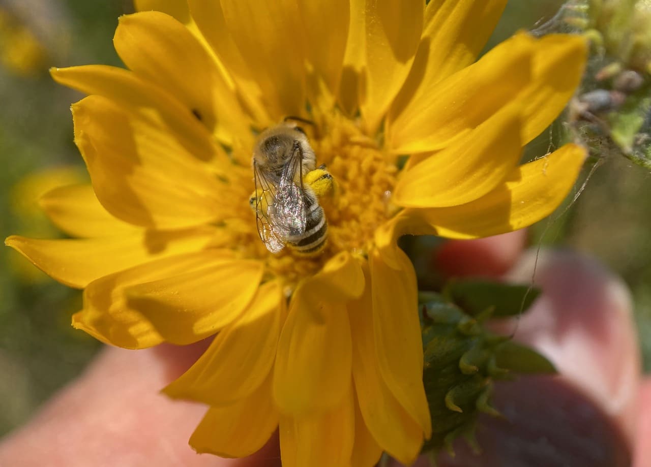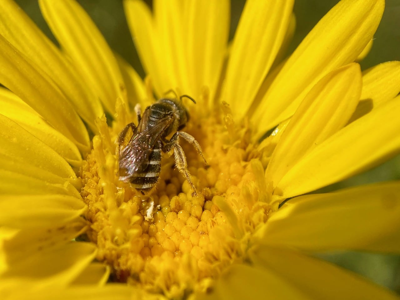 A fuzzy little bee with black-and-white striped abdomen is foraging on a Grindelia flowerhead. It is a Cellophane Bee, Colletes sp. (family Colletidae).