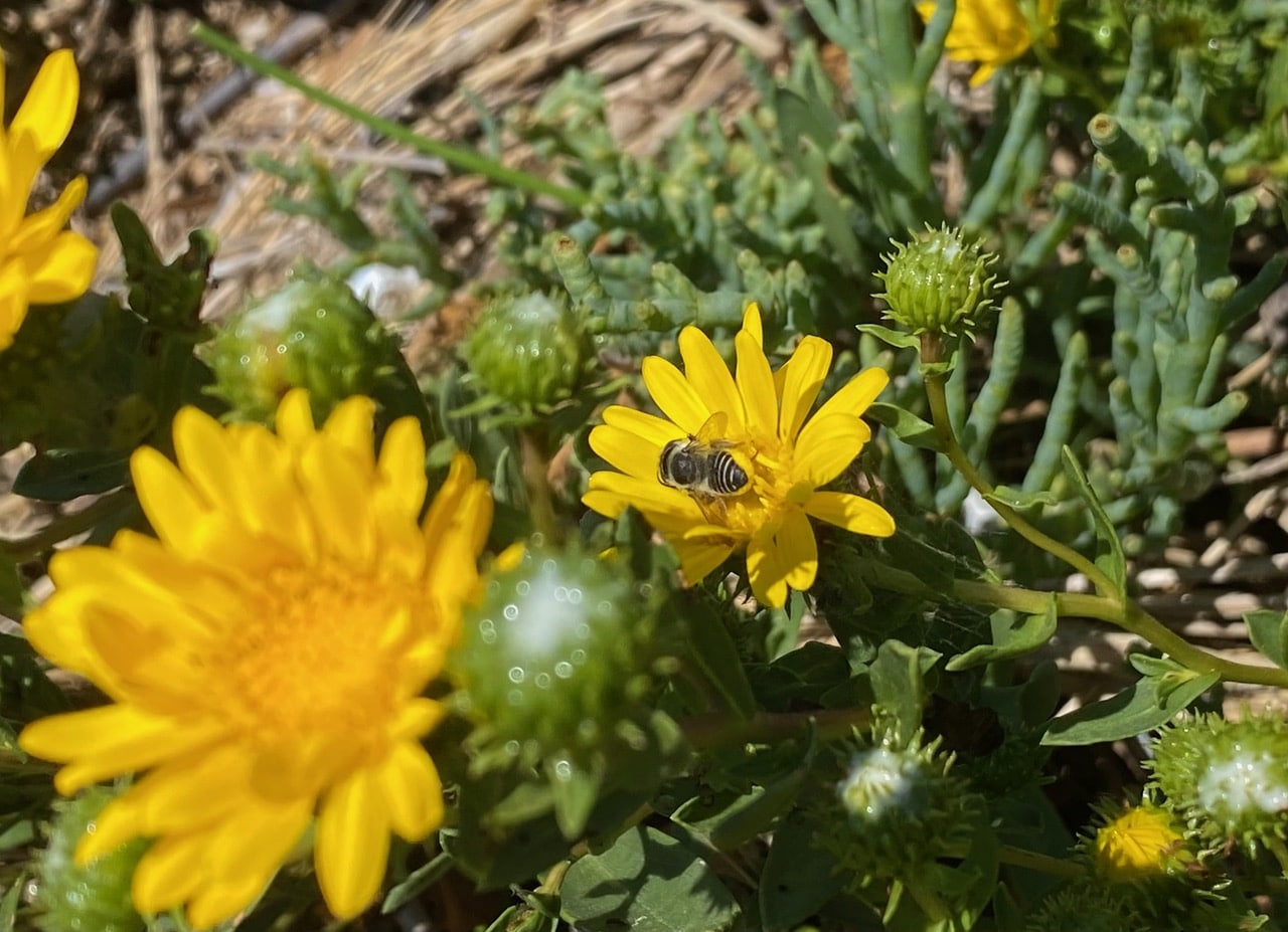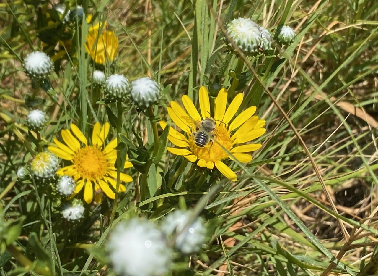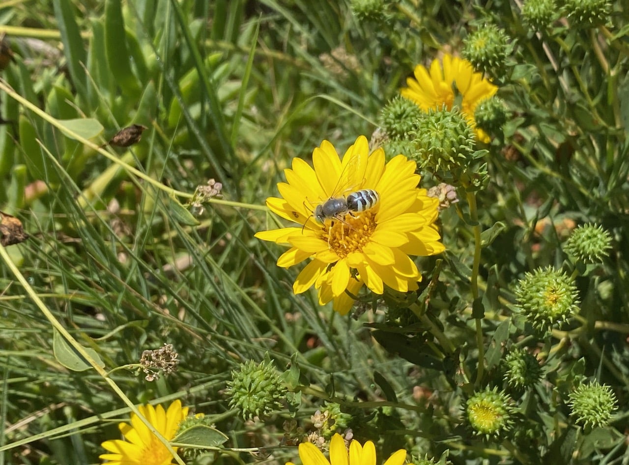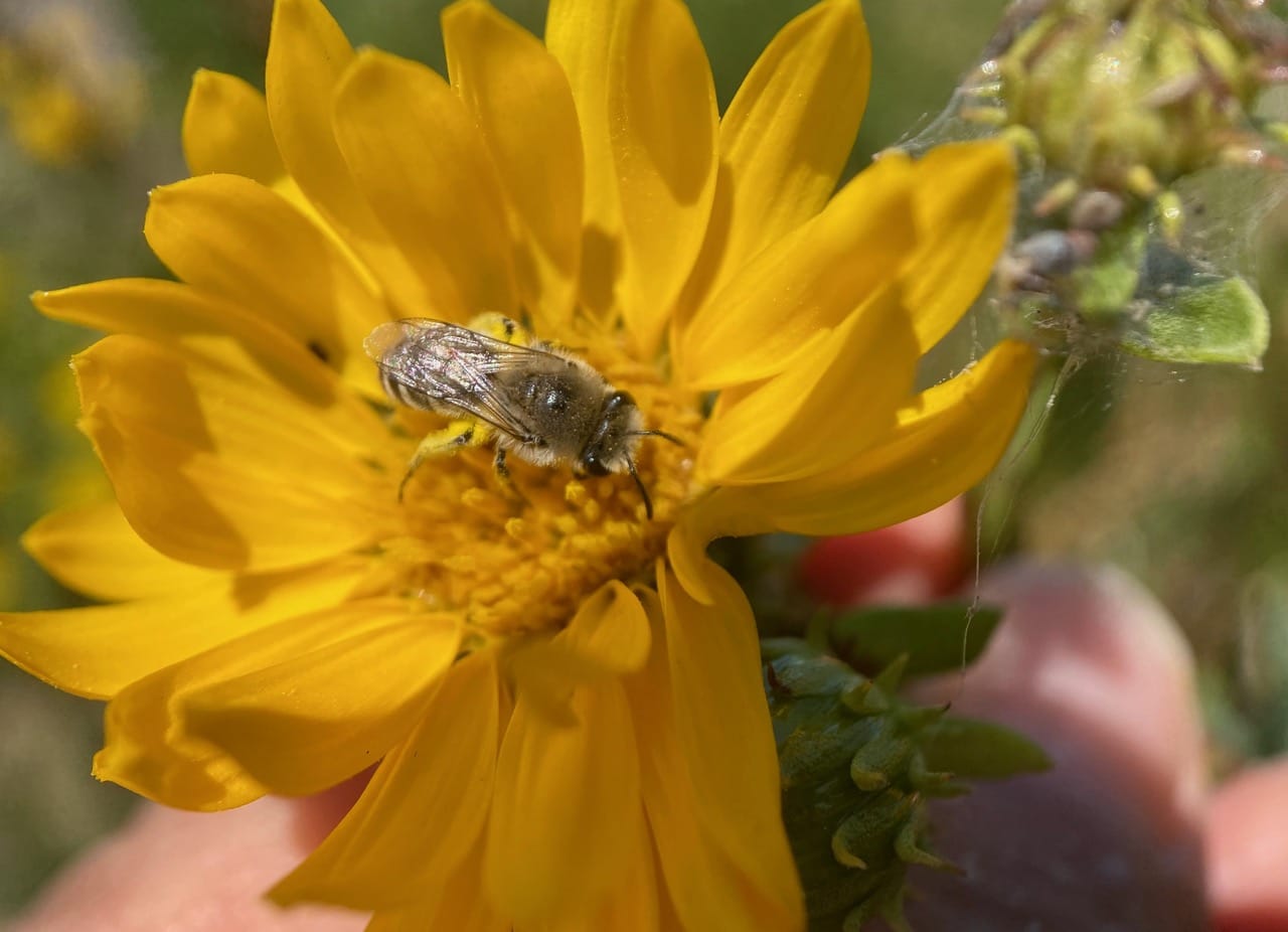 Hey, that’s a female Western Leafcutter Bee, Megachile perihirta (family Megachilidae) on another Grindelia flowerhead. Note the yellow pollen on the underside of her abdomen.