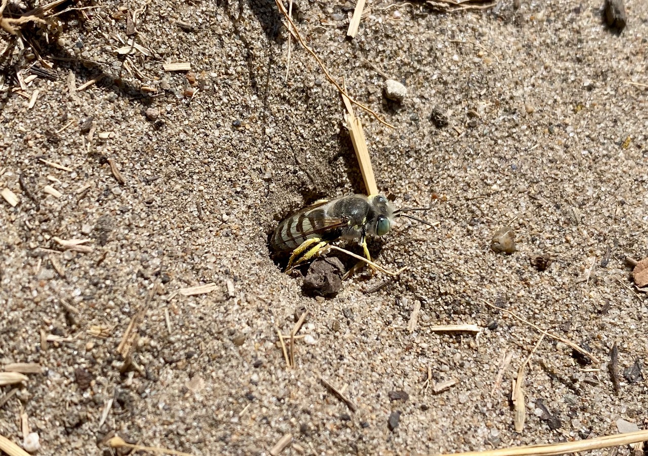 Sand wasps in the genus Bembix are familiar and common throughout North America, digging their burrows in dunes, on beaches, and other habitats with loose, deep sand. The female rapidly kicks out large quantities of sand using a “tarsal rake” of spines on each front leg. The burrow is excavated before the wasp goes hunting. Bembix are generalist, opportunistic hunters. True flies in the order Diptera are the usual prey. A victim is paralyzed or killed by the wasp’s sting, and is then flown back to the nest. Most species will lay an egg on the first victim, while some species lay an egg in the empty cell before starting to hunt. Once the egg hatches, mama wasp brings flies to her larva as needed. This “progressive provisioning” is rare in the insect world. When the larva reaches maturity, mama wasp closes the cell. Inside, the larva spins an oblong cocoon, weaving sand grains into the structure and resulting in a hardened capsule. Overwintering takes place as a prepupa inside this cocoon, but there are usually two generations a year.