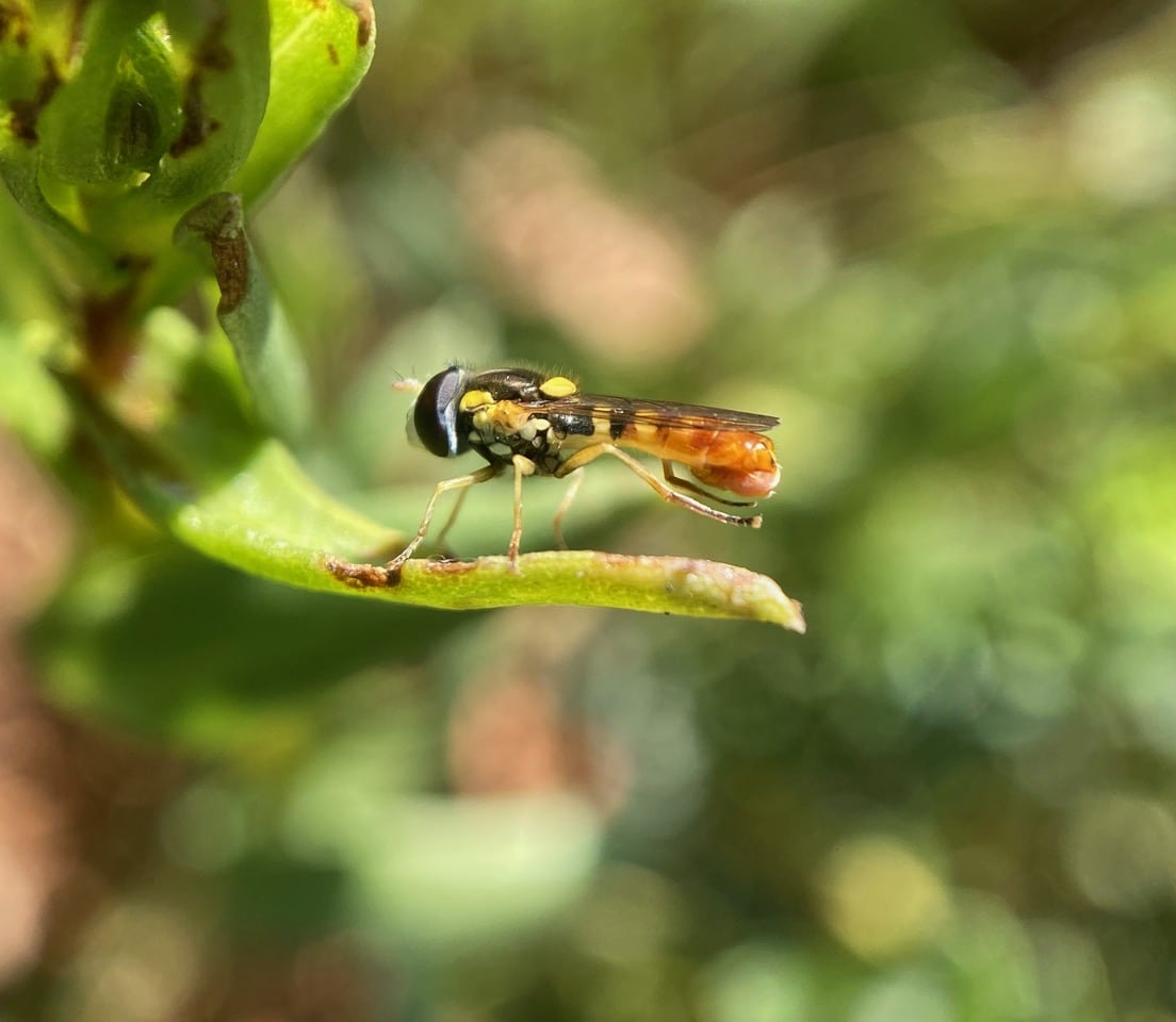 The Forked Globetail, Sphaerophoria sulphuripes (family Syrphidae) is a hover fly native to western North America. Adults visit flowers for nectar and pollen. Larvae feed on aphids and other soft-bodied insects. There is marked sexual dimorphism in the species – the males have a slender abdomen with a reddish, swollen tip.