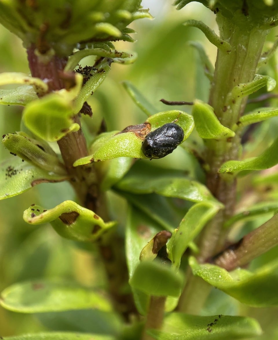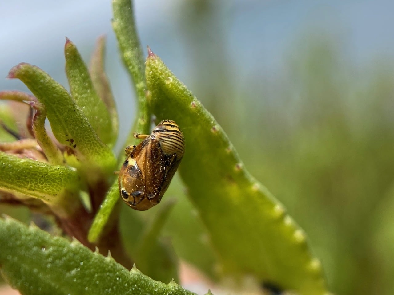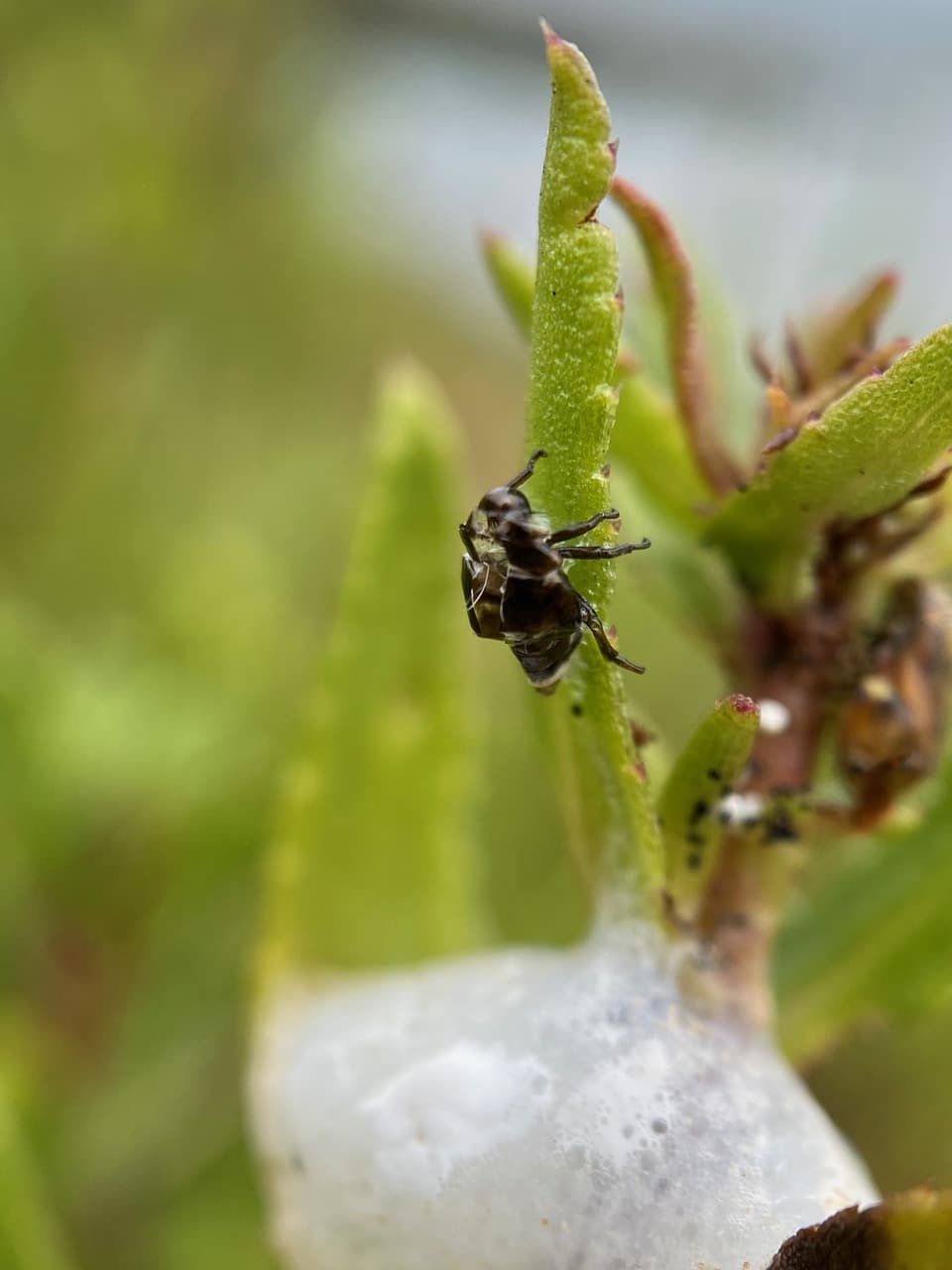 Here’s another one of the adult Spittlebug, Complex Clastoptera lineatocollis (family Clastopteridae). It is smaller than the brown ones and is almost all black. It is highly unlikely that we have two different species of Spittlebugs infesting the Grindelia at the same time. I think both the brown and black individuals are the same species exhibiting sexual dimorphism, the larger brown ones being females.