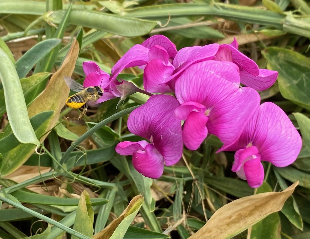 The bee next lands on an adjacent flower, her weight spreading the wing petals apart. Note that the dark lines on the two upper petals (banners) converge at the base of the petals, serving as ‘nectar guides’ for pollinators. There is even a contrasting white patch to guide the visitors. Bees’ eyes are more sensitive to white and yellow, in contrast to the red colors. What a nice demonstration of how pollination works on the Everlasting Pea flower.