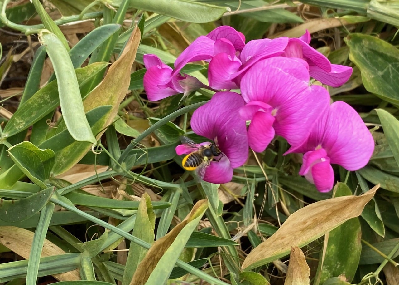 This robust, sprawling patch of Everlasting Pea, Lathyrus latifolius has been blooming for a while along the shore, but I never seem to see much insect activity on these showy flowers.