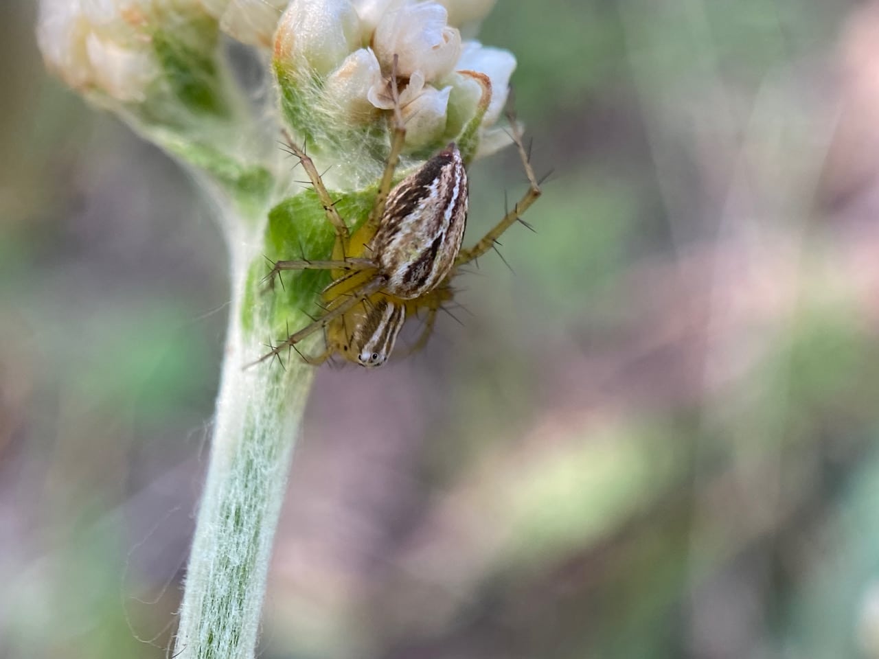 A female Striped Lynx Spider is stationed in ambush under a cluster of flowerheads of California Everlasting, Pseudognaphalium californicum.