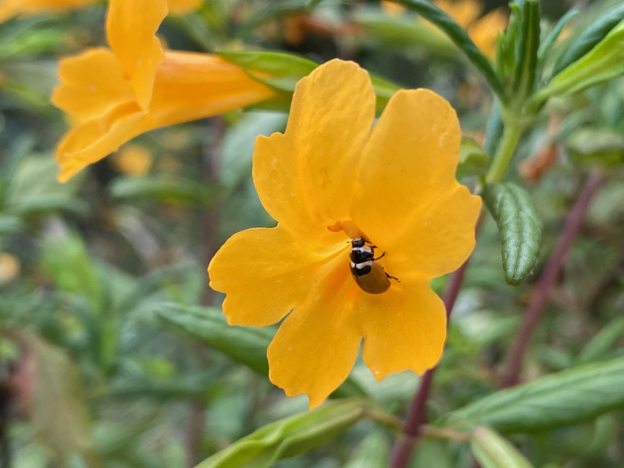 Hey, that’s a Three-banded Ladybeetle feeding on the pollen of Sticky Monkeyflower. Although Ladybeetles are commonly known as predators of aphids and other soft-bodied insects, they also feed on pollen and nectar when prey is scarce.