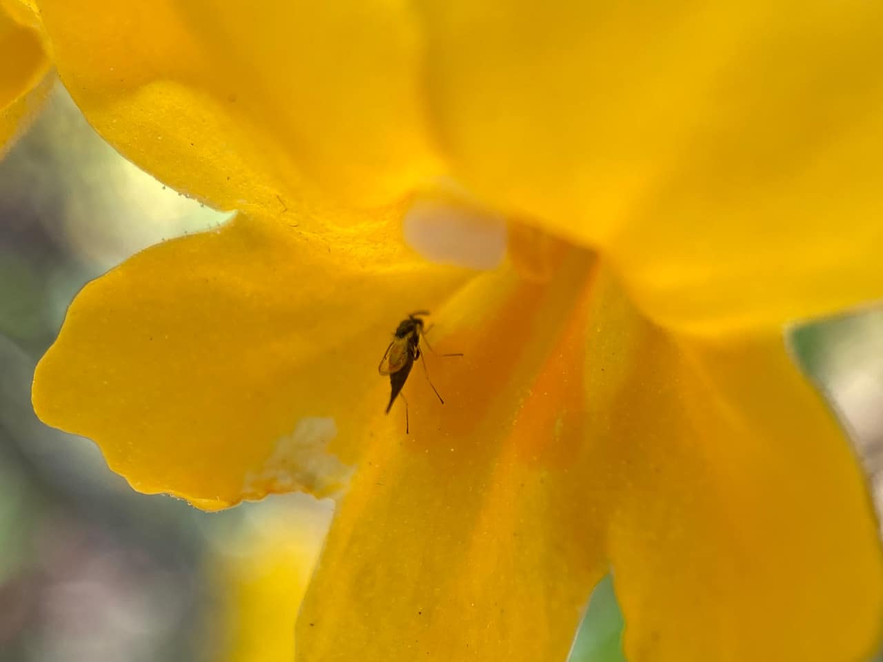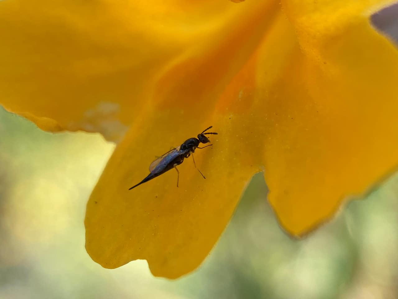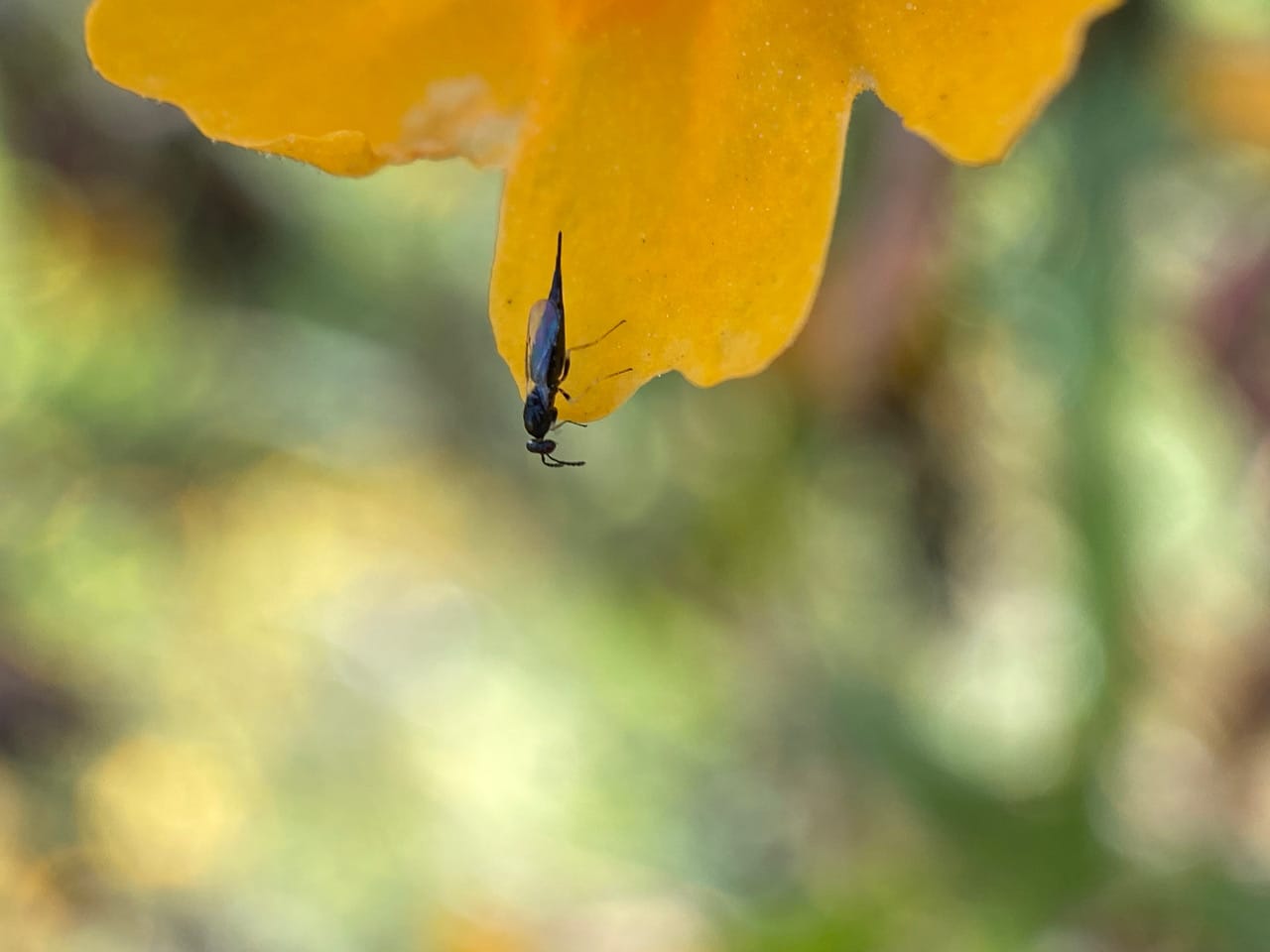 A black sliver of an insect on a Sticky Monkeyflower turns out to be a tiny wasp. For this size, one immediately suspects a parasitoid wasp. It is most likely a Chalcid Wasp in the superfamily Chalcidoidea.