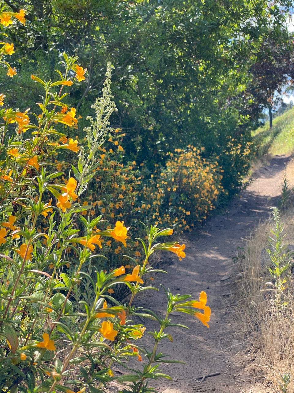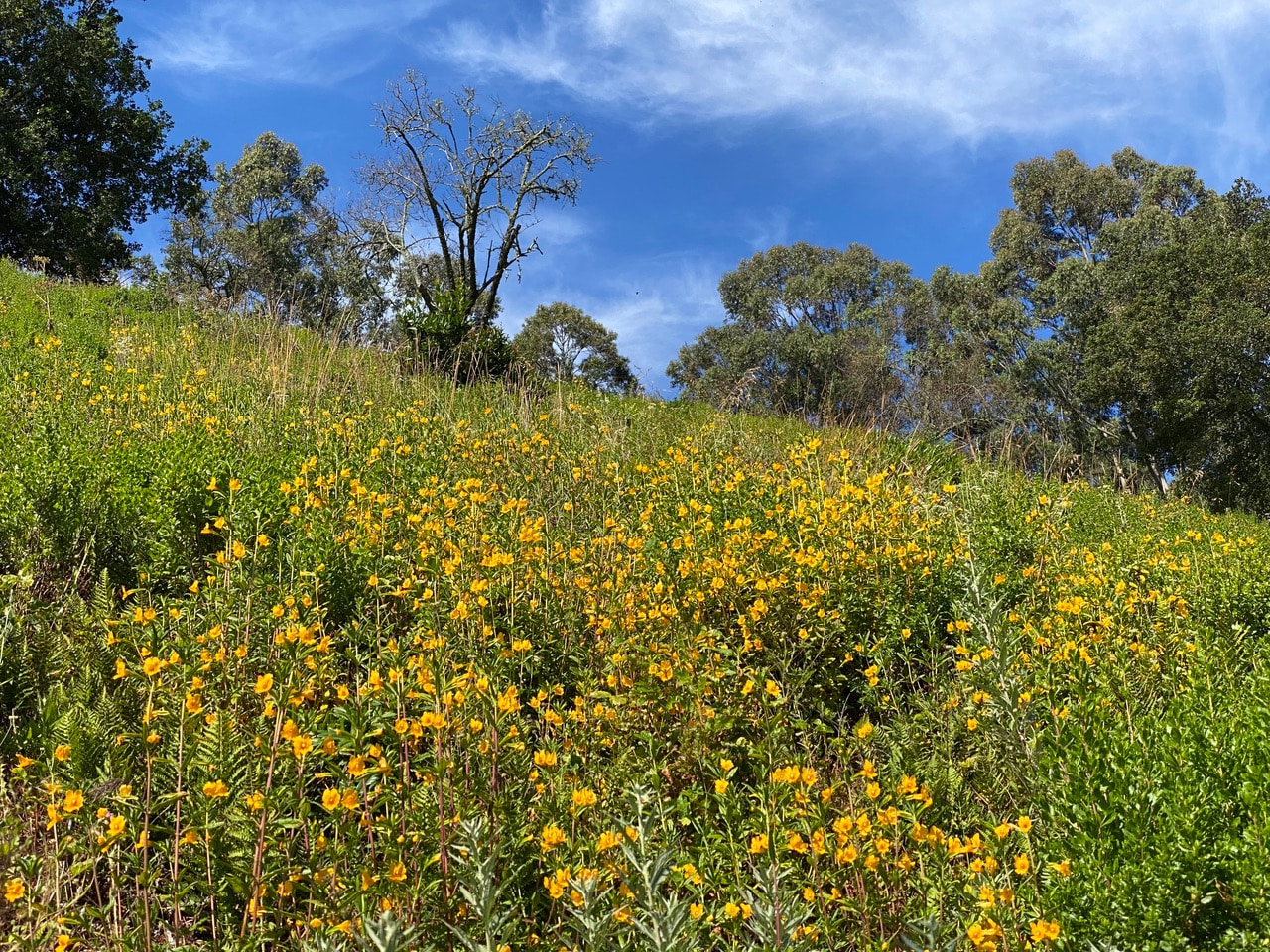 This stretch of Skyline Trail is flanked on the east side by countless Sticky Monkeyflowers in the partial shade of Bay Trees, while the steep slope on the west is ablaze with the golden blooms as well.