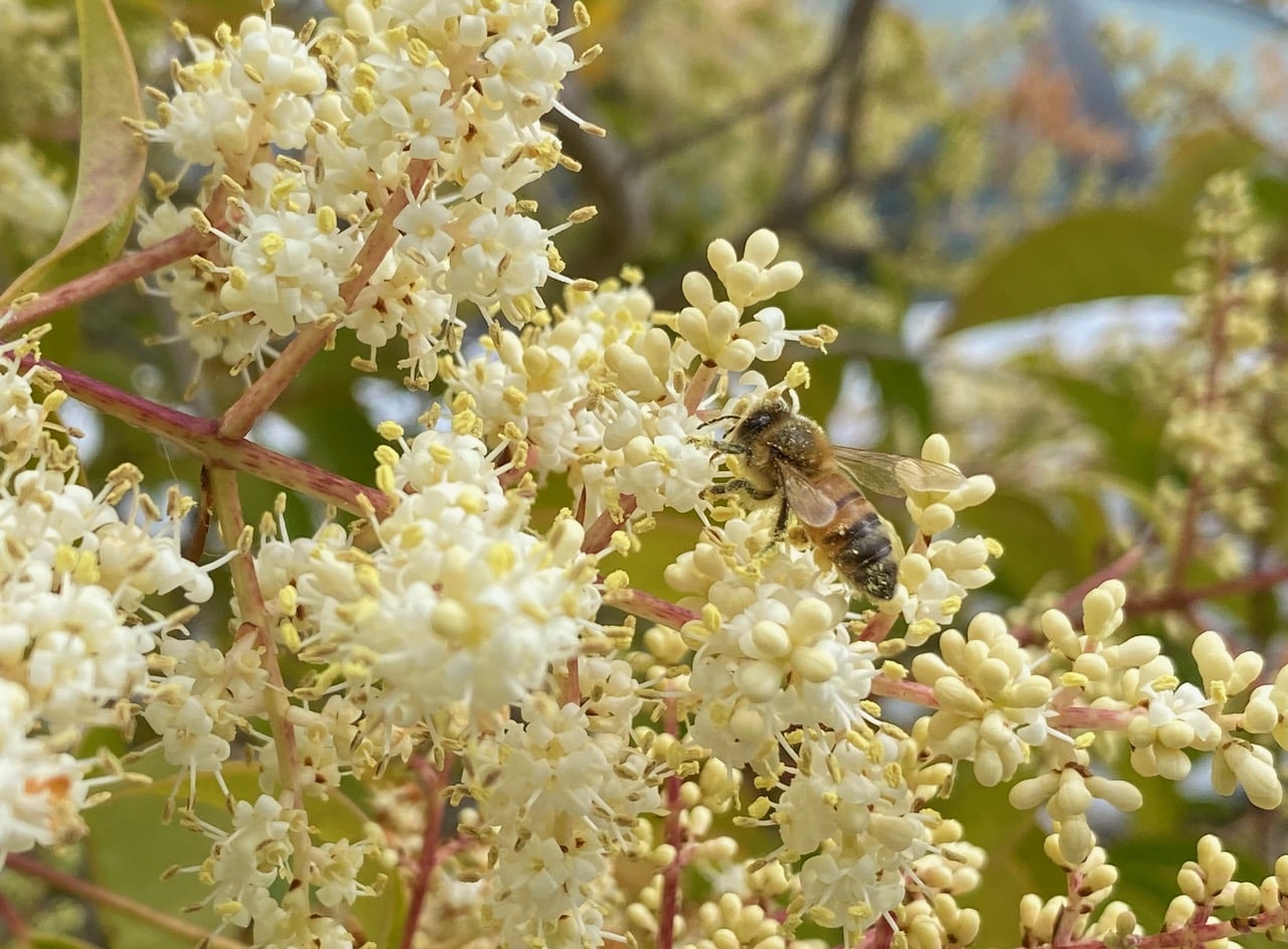 So prolific is the pollen production of the Tree Privet that this foraging Honey Bee, Apis mellifera (family Apidae) is covered with its sticky pollen.