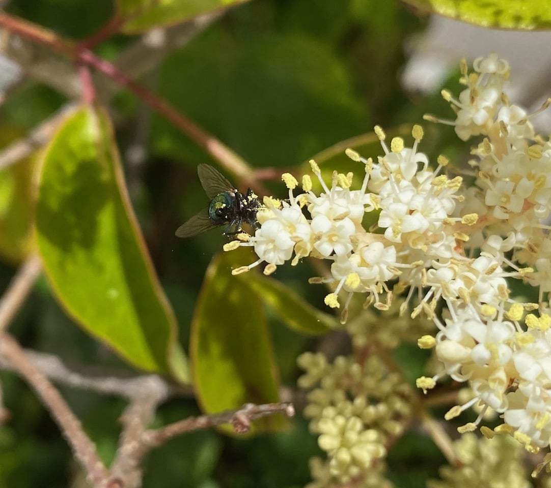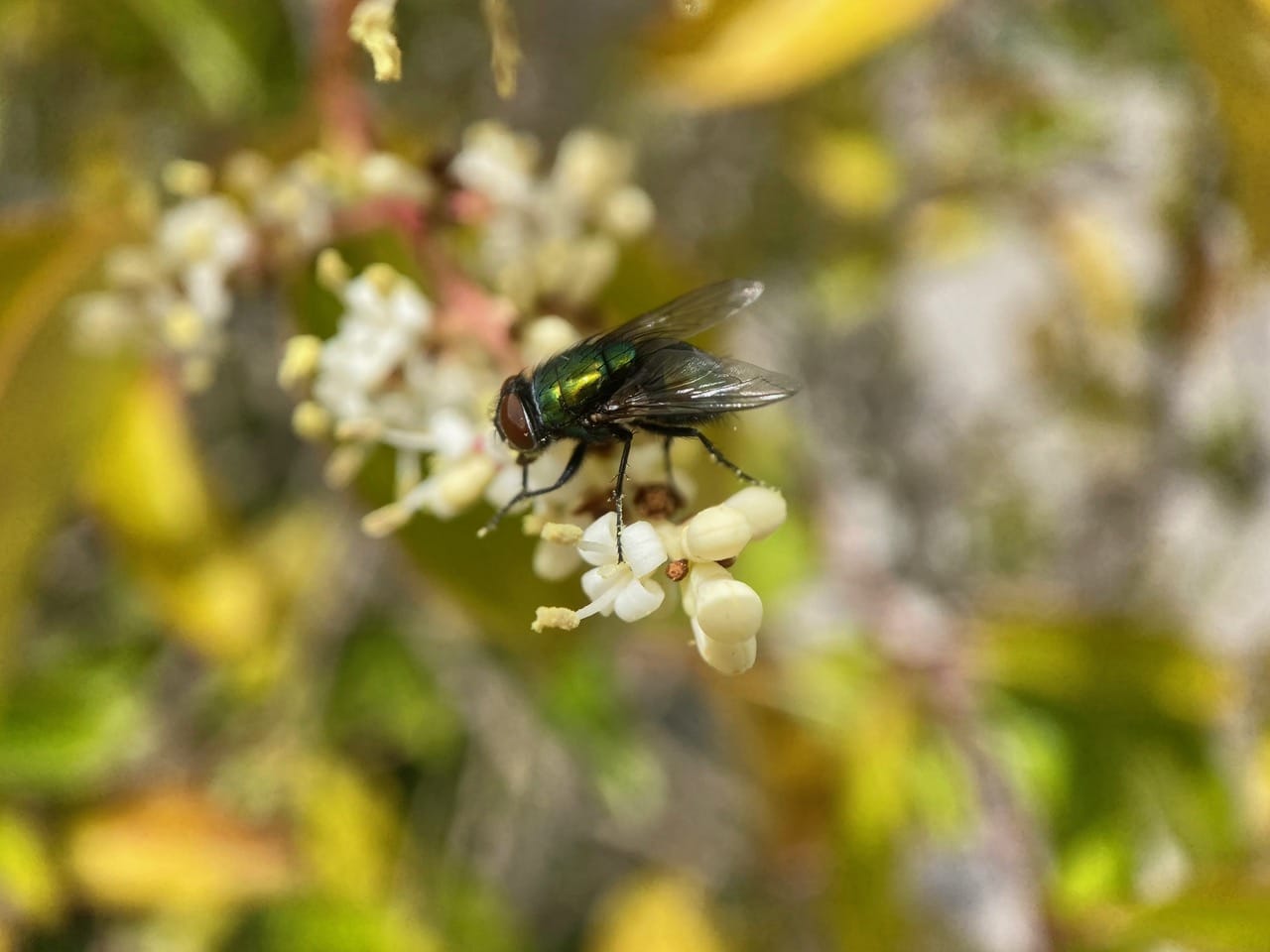 Covered with pollen, a Common European Greenbottle fly, Lucilia sericata (family Calliphoridae) is foraging on an inflorescence of the Tree Privet.