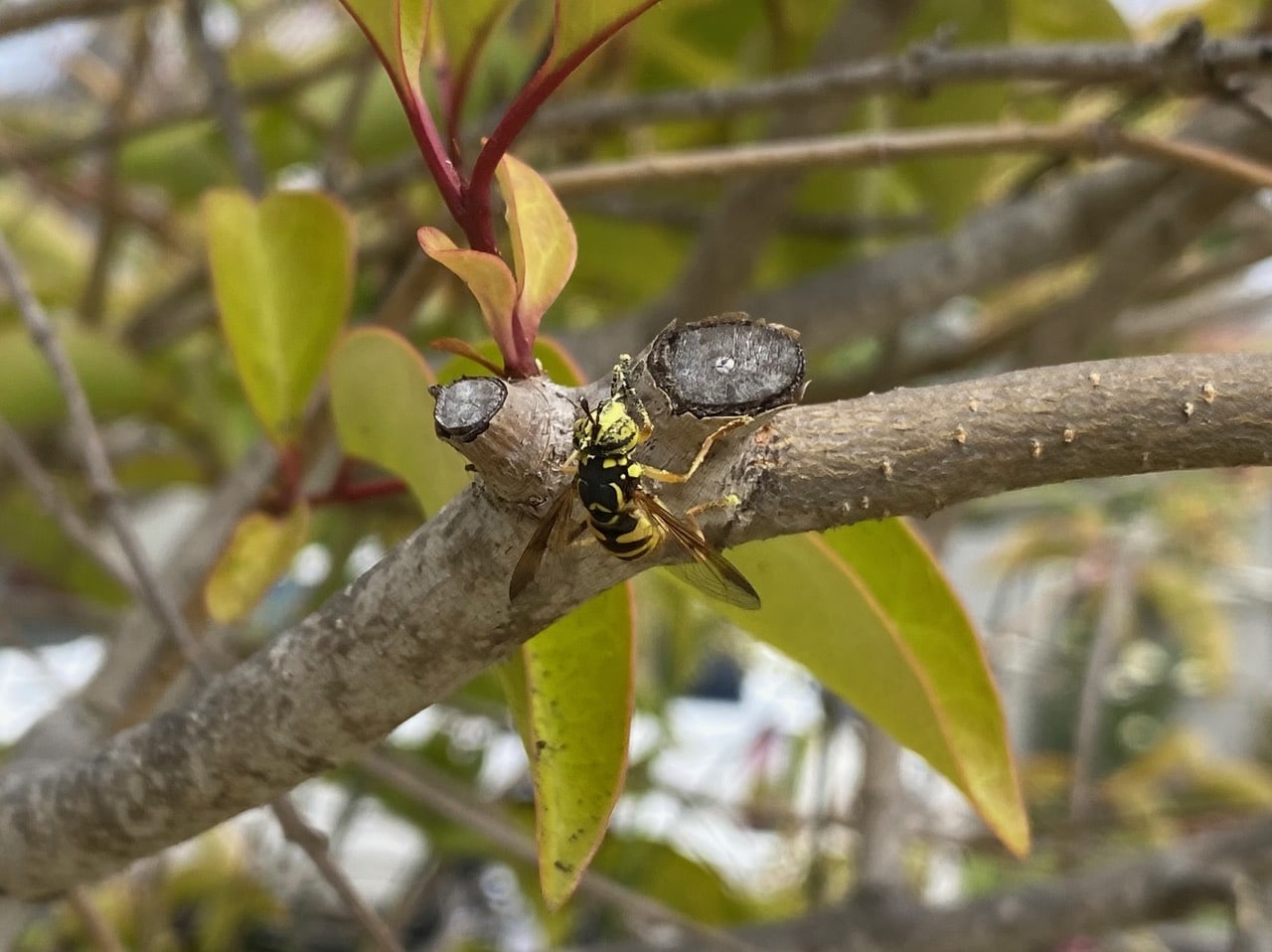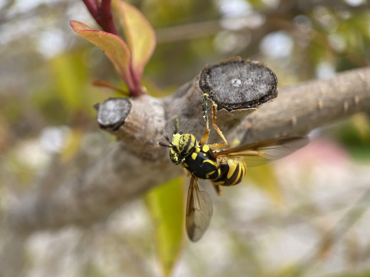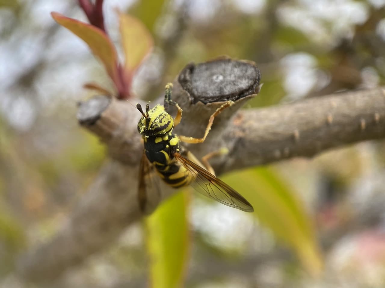 The hover fly finally comes down to groom itself on a lower branch where I can see it clearly. Again, it engages in that odd behavior of swinging its wings from side to side – something I never see a Yellowjacket do. I switch my camera to video mode to record the behavior.